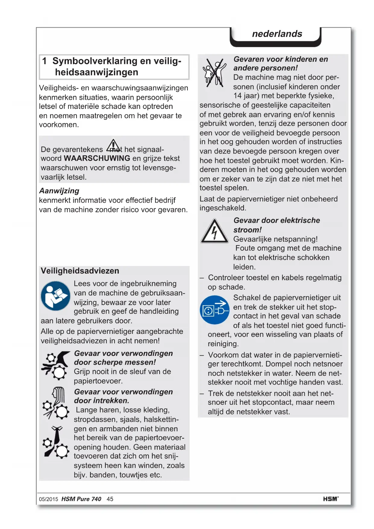 - Laat het snijwerk zonder papiertoevoer ca. 10 s in de permanente modus lopen. Papieropstopping en snippers worden verwijderd. WAARSCHUWING Gevaarlijke netspanning! Foute omgang met de machine kan tot elektrische schokken leiden. Schakel de papiervernietiger voor verplaatsen of reinigen uit en trek de stekker uit het stop- contact. Servicewerkzaamheden, die met het verwijderen van behuizings- afdekkingen zijn verbonden, mogen alleen door de HSM-klan- tenservice en service-technici van onze dealers worden uitgevoerd. Klantendienstadressen zie pagina 160.05/2015 HSM Pure 740 51 nederlands De papiervernietiger voldoet aan de geldende harmonisatiewetgeving van de EU: