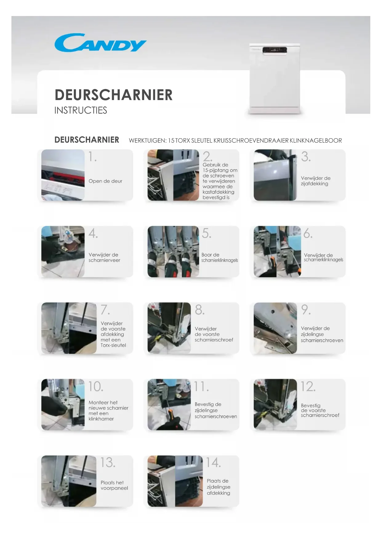 ONDERSTE KORF INSTRUCTIES ONDERSTE SPROEIERARM We raden u aan de bovenstaande instructies te volgen. Vraag bij twijfel deskundig advies. Haier Europe wijst alle aansprakelijkheid af voor enige schade die kan voortvloeien uit veronachtzaming van de gegeven instructies.1. Zdjąć przednią osłonę za pomocą klucza TorxWykręcić śrubę przedniego zawiasu Usunąć śruby bocznych zawiasów Zamontować nowy zawias za pomocą nitownicy