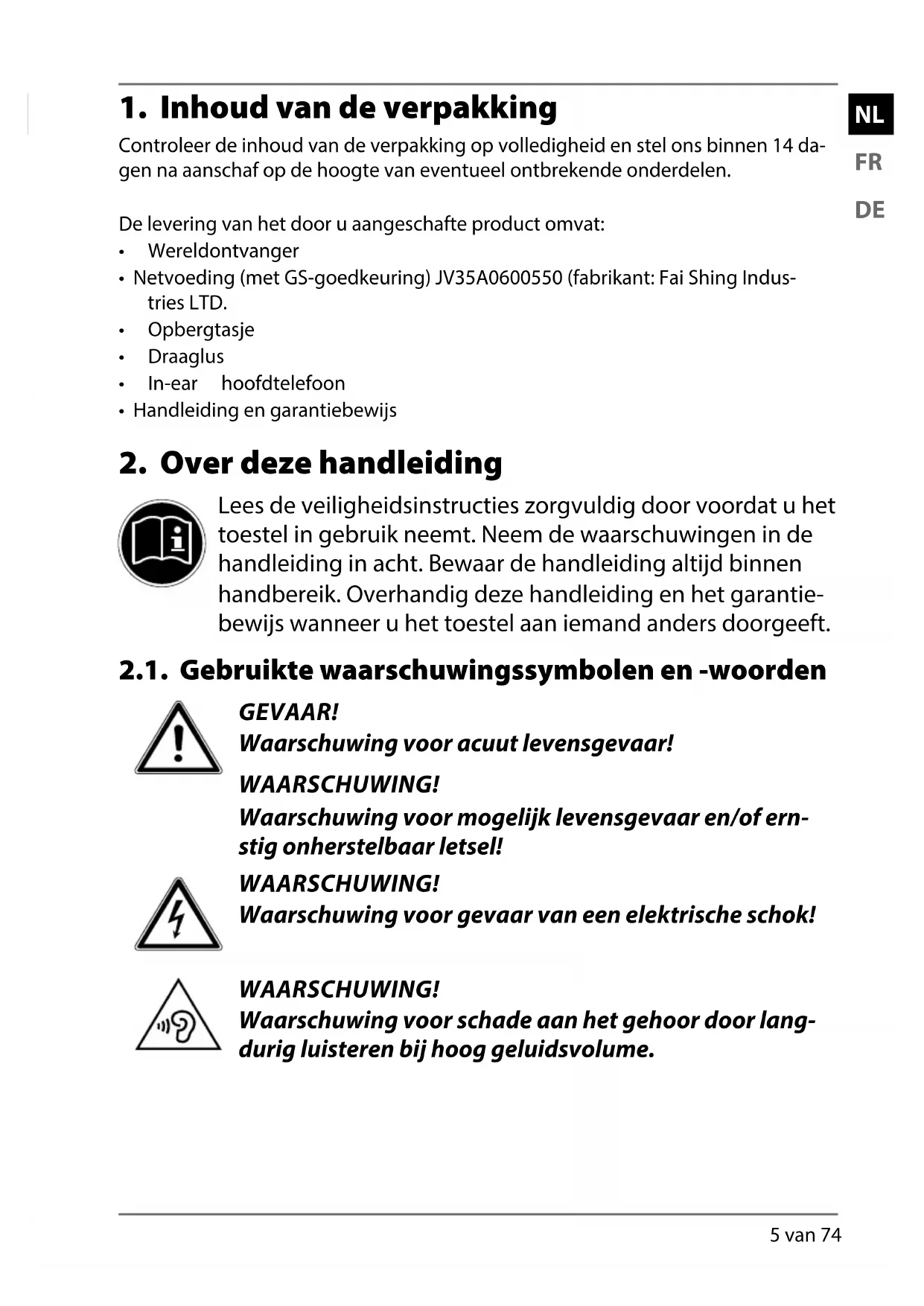 Lees de veiligheidsinstructies zorgvuldig door voordat u het toestel in gebruik neemt. Neem de waarschuwingen in de handleiding in acht. Bewaar de handleiding altijd binnen handbereik. Overhandig deze handleiding en het garantie- bewijs wanneer u het toestel aan iemand anders doorgeeft. 2.1. Gebruikte waarschuwingssymbolen en -woorden GEVAAR! Waarschuwing voor acuut levensgevaar! WAARSCHUWING! Waarschuwing voor mogelijk levensgevaar en/of ern- stig onherstelbaar letsel! WAARSCHUWING! Waarschuwing voor gevaar van een elektrische schok! WAARSCHUWING! Waarschuwing voor schade aan het gehoor door lang- durig luisteren bij hoog geluidsvolume. 84943 Aldi BE Content Final.indb 584943 Aldi BE Content Final.indb 5 26.06.2015 12:37:3226.06.2015 12:37:326 van 74 VOORZICHTIG! Neem alle aanwijzingen in acht om letsel en materiële scha- de te voorkomen! LET OP! Neem de aanwijzingen in acht om materiële schade te voor- komen! OPMERKING! Nadere informatie over het gebruik van het toestel. OPMERKING! Neem de aanwijzingen in de handleiding in acht!