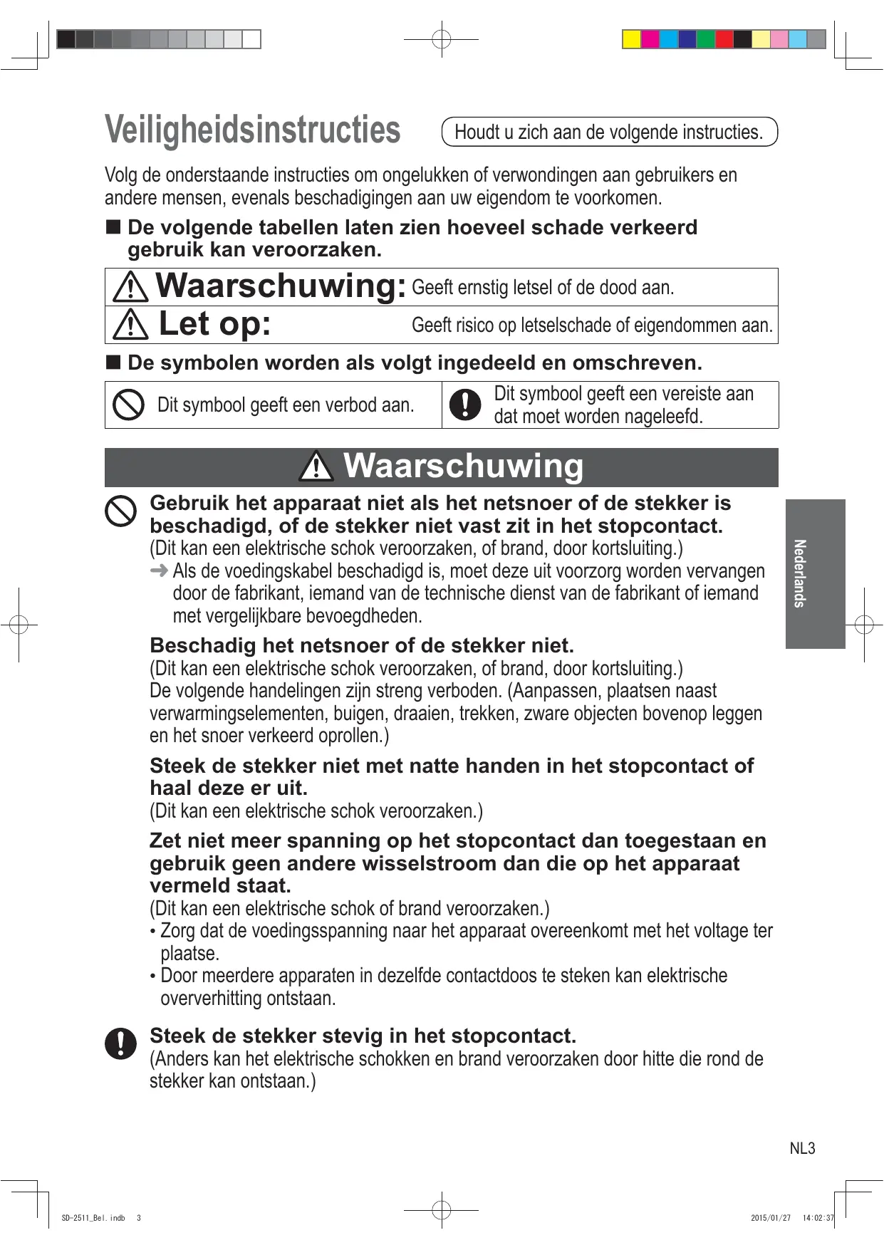 Veiligheidsinstructies Houdt u zich aan de volgende instructies. Volg de onderstaande instructies om ongelukken of verwondingen aan gebruikers en andere mensen, evenals beschadigingen aan uw eigendom te voorkomen. wDe volgende tabellen laten zien hoeveel schade verkeerd gebruik kan veroorzaken. Waarschuwing: Geeft ernstig letsel of de dood aan. Geeft risico op letselschade of eigendommen aan. Let op: wDe symbolen worden als volgt ingedeeld en omschreven. Dit symbool geeft een vereiste aan Dit symbool geeft een verbod aan. dat moet worden nageleefd. Waarschuwing Nederlands Gebruik het apparaat niet als het netsnoer of de stekker is beschadigd, of de stekker niet vast zit in het stopcontact. (Dit kan een elektrische schok veroorzaken, of brand, door kortsluiting.) « Als de voedingskabel beschadigd is, moet deze uit voorzorg worden vervangen door de fabrikant, iemand van de technische dienst van de fabrikant of iemand met vergelijkbare bevoegdheden. Beschadig het netsnoer of de stekker niet. (Dit kan een elektrische schok veroorzaken, of brand, door kortsluiting.) De volgende handelingen zijn streng verboden. (Aanpassen, plaatsen naast verwarmingselementen, buigen, draaien, trekken, zware objecten bovenop leggen en het snoer verkeerd oprollen.) Steek de stekker niet met natte handen in het stopcontact of haal deze er uit. (Dit kan een elektrische schok veroorzaken.) Zet niet meer spanning op het stopcontact dan toegestaan en gebruik geen andere wisselstroom dan die op het apparaat vermeld staat. (Dit kan een elektrische schok of brand veroorzaken.) Ɣ Zorg dat de voedingsspanning naar het apparaat overeenkomt met het voltage ter plaatse. Ɣ Door meerdere apparaten in dezelfde contactdoos te steken kan elektrische oververhitting ontstaan. Steek de stekker stevig in het stopcontact. (Anders kan het elektrische schokken en brand veroorzaken door hitte die rond de stekker kan ontstaan.) NL3 6'B%HOLQGE