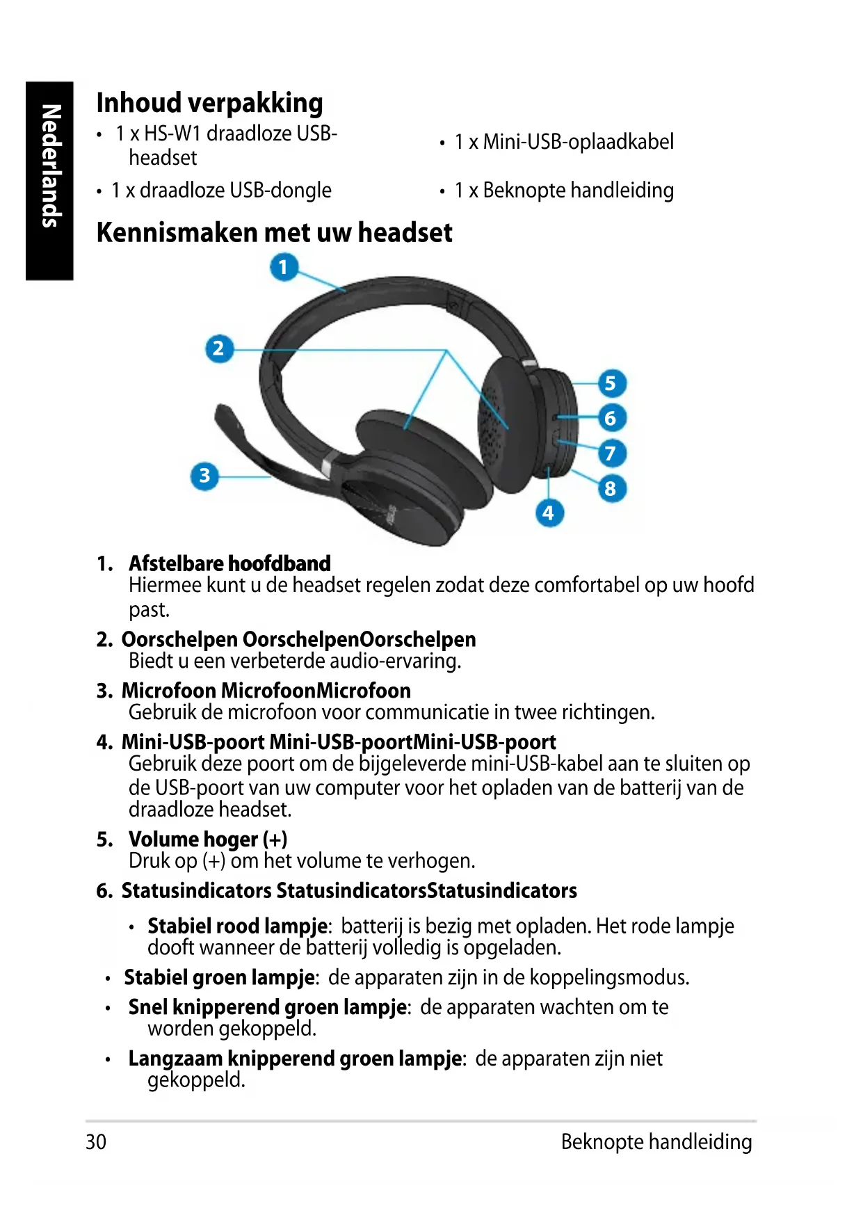 Druk op (-) om het volume te verlagen. ASUS.HS-W1 draadloze USB-headset32 Nederlands De draadloze headset en de draadloze USB-dongle koppelen De draadloze headset en de draadloze USB-dongle koppelen: 1. Sluit de bijgeleverde draadloze USB-dongle aan op de USB-poort van uw Sluit de bijgeleverde draadloze USB-dongle aan op de USB-poort van uwSluit de bijgeleverde draadloze USB-dongle aan op de USB-poort van uw computer voor een draadloze transmissie tot op 15 meter. 2. Houd de voedingsknop enkele seconden ingedrukt tot de statusindicator Houd de voedingsknop enkele seconden ingedrukt tot de statusindicatorHoud de voedingsknop enkele seconden ingedrukt tot de statusindicator groen wordt. U kunt nu starten met het gebruik van uw draadloze headset om muziek te beluisteren of te chatten met vrienden. De microfoon in-/uitschakelen De microfoon inschakelen