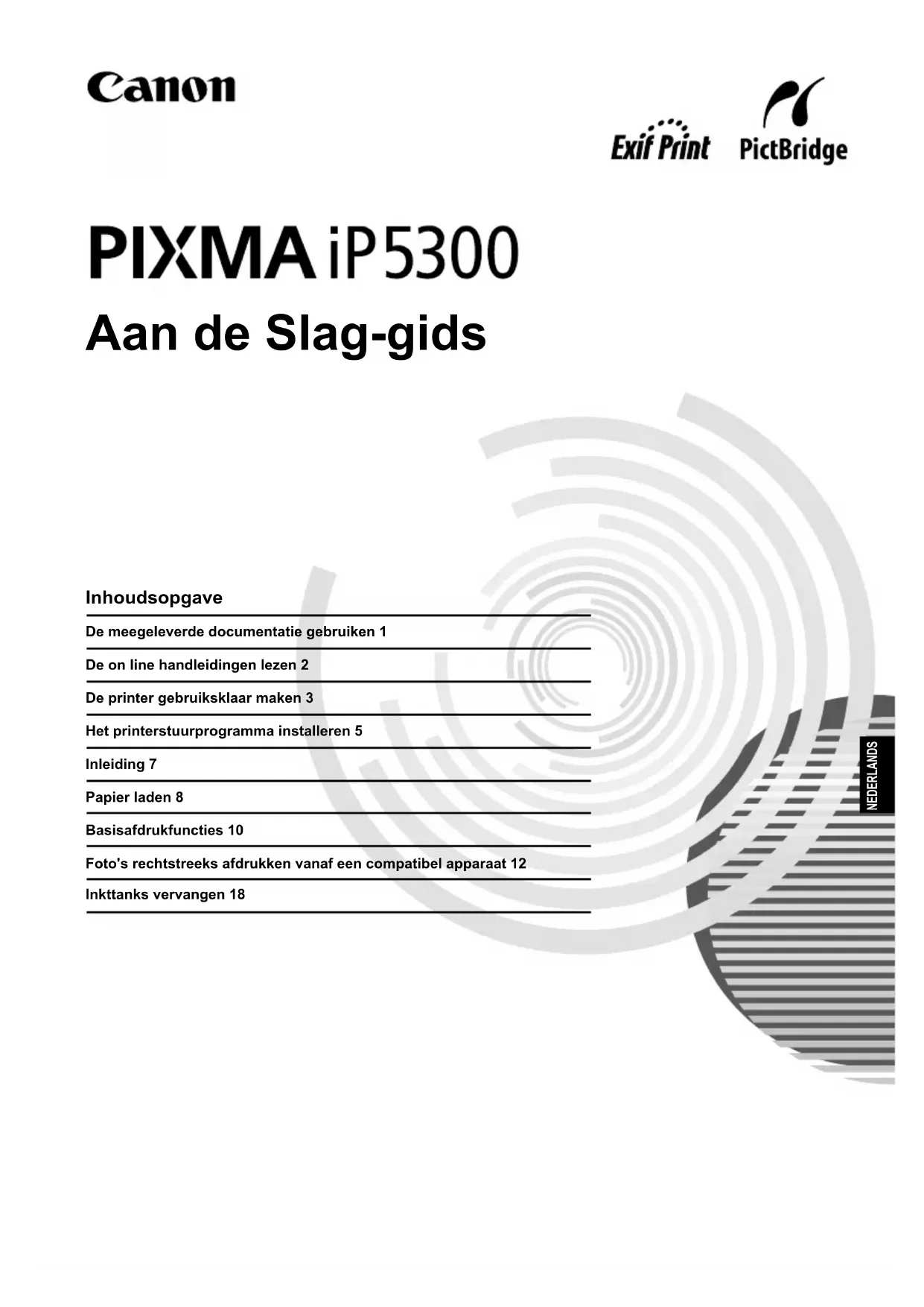 -kantoorapparatuurprogramma is een wereldwijd programma dat energiebesparing bevordert bij het gebruik van computer- en andere kantoorapparatuur. Het programma ondersteunt de ontwikkeling en verspreiding van producten met energiebesparende functies. Het is een open systeem waaraan bedrijven vrijwillig kunnen deelnemen en heeft betrekking op kantoorapparatuur zoals computers, monitoren, printers, faxen en kopieerapparaten. De normen en de logo's zijn voor alle deelnemende landen hetzelfde. Vereisten voor de elektriciteitsvoorziening Gebruik nooit een voedingsspanning die afwijkt van de netspanning in het land van aanschaf. Gebruik van een verkeerde netspanning kan leiden tot brand of elektrische schokken. De correcte netspanning en frequentie voor de netvoeding zijn als volgt: AC 100-240 V, 50/60 Hz Over consumptiegoederen Consumptiegoederen zoals inkttanks en FINE-cartridges (FINE Cartridges) zijn verkrijgbaar tot 5 jaar nadat de productie is gestopt. Veiligheidsvoorschriften Modelnummer: K10285 (iP5300) Waarschuwing z Probeer nooit met natte handen de stekker in het stopcontact te steken of uit het stopcontact te verwijderen. z Het netsnoer mag niet worden beschadigd, aangepast of uitgerekt of overmatig worden gebogen of verdraaid. Plaats geen zware voorwerpen op het netsnoer. z Gebruik nooit een andere netspanning dan de standaardnetspanning in het land waar de printer is aangeschaft. Gebruik van een verkeerde netspanning of frequentie kan leiden tot brand of elektrische schokken.z Steek de stekker altijd geheel in het stopcontact. Let op! z Houd de inkttanks uit voorzorg buiten het bereik van kinderen. z Laat de inkttanks niet vallen en schud ze niet, omdat er anders inkt uit de tanks op uw handen of kleding kan lekken. Lees ook de Veiligheidsvoorschriften in de on line Gebruikershandleiding. Besteed aandacht aan de waarschuwingen om persoonlijk letsel en schade aan de printer te voorkomen.1De meegeleverde documentatie gebruiken NEDERLANDS De meegeleverde documentatie gebruiken Eenvoudige installatie-instructies (installatieblad) Lees eerst dit installatieblad. Dit blad bevat aanwijzingen voor het installeren en instellen van de printer, waarmee u het apparaat klaarmaakt voor gebruik. Aan de Slag-gids (deze handleiding) Lees deze handleiding als u de printer voor het eerst gaat gebruiken. Nadat u de aanwijzingen in de Eenvoudige installatie-instructies (installatieblad) hebt gelezen, raden we u aan om deze handleiding te lezen, zodat u bekend raakt met de basisbediening, zoals afdrukken vanaf de computer en vanaf een PictBridge-compatibel apparaat. On line handleidingen Gebruikershandleiding Lees deze handleiding als u de printer voor het eerst gaat gebruiken. Als de Aan de Slag-gids u niet de informatie verschaft waarnaar u op zoek bent, kunt u de Gebruikershandleiding raadplegen. Deze kunt u vanaf de [Setup CD- ROM/Installatiecd-rom] installeren. Deze handleiding bevat gedetailleerde aanwijzingen voor: z afdrukken vanaf de computer z geschikte mediumtypen z routineonderhoud z problemen oplossen Ook zijn er speciale handleidingen beschikbaar voor geavanceerde functies. Handleiding printerstuurprogramma Raadpleeg deze handleiding voor alle aanwijzingen met betrekking tot de printerdriver. [Photo Application Guide/Handleiding voor fotografische toepassingen] Raadpleeg deze handleiding voor aanwijzingen over het gebruik van de diverse toepassingen die op de [Setup CD-ROM/Installatiecd-rom] zijn meegeleverd.2 De on line handleidingen lezen NEDERLANDS De on line handleidingen lezen Naast deze Aan de Slag-gids worden er ook on line handleidingen bij uw printer geleverd. Voor gedetailleerde instructies voor het installeren van de on line handelingen verwijzen we u naar het Eenvoudige installatie-instructies (installatieblad). U kunt de on line handleidingen op de volgende wijze weergeven: Als u de on line handleiding wilt weergeven, klikt u op het bureaublad op het snelkoppelingspictogram [iP5300 On-screen Manual/iP5300 On line handleiding]. U kunt ook het volgende doen: klik op [Start] > [All Programs/Alle programma's] (of [Programs/ Programma's]) > [Canon iP5300 Manual/Canon iP5300 Handleiding] > [iP5300 On-screen Manual/iP5300 On line handleiding]. Systeemvereisten Browser: Windows HTML Help Viewer Als u de on line handleiding wilt openen, dubbelklikt u op de alias [iP5300 On-screen Manual/ iP5300 On line handleiding] op het bureaublad. Systeemvereisten Browser: Help Viewer Opmerking z Microsoft Internet Explorer
