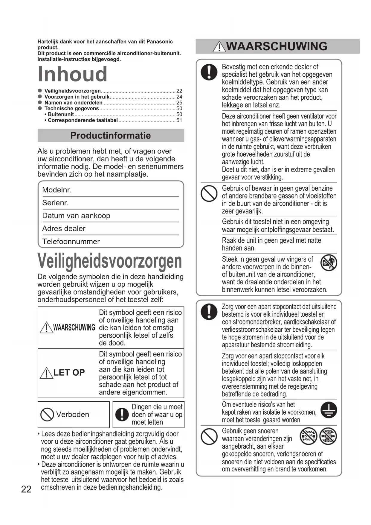 - Corresponderende taaltabel ....................................... 51 Inhoud Veiligheidsvoorzorgen Productinformatie Als u problemen hebt met, of vragen over uw airconditioner, dan heeft u de volgende informatie nodig. De model- en serienummers bevinden zich op het naamplaatje. Modelnr. Serienr. Datum van aankoop Adres dealer Telefoonnummer Bevestig met een erkende dealer of specialist het gebruik van het opgegeven koelmiddeltype. Gebruik van een ander koelmiddel dat het opgegeven type kan schade veroorzaken aan het product, lekkage en letsel enz. Deze airconditioner heeft geen ventilator voor het inbrengen van frisse lucht van buiten. U moet regelmatig deuren of ramen openzetten wanneer u gas- of olieverwarmingsapparaten in de ruimte gebruikt, want deze verbruiken grote hoeveelheden zuurstuf uit de aanwezige lucht. Doet u dit niet, dan is er in extreme gevallen gevaar voor verstikking. Gebruik of bewaar in geen geval benzine of andere brandbare gassen of vloeistoffen in de buurt van de airconditioner - dit is zeer gevaarlijk. Gebruik dit toestel niet in een omgeving waar mogelijk ontplofngsgevaar bestaat. Raak de unit in geen geval met natte handen aan. Steek in geen geval uw vingers of andere voorwerpen in de binnen- of buitenunit van de airconditioner, want de draaiende onderdelen in het binnenwerk kunnen letsel veroorzaken. De volgende symbolen die in deze handleiding worden gebruikt wijzen u op mogelijk gevaarlijke omstandigheden voor gebruikers, onderhoudspersoneel of het toestel zelf: WAARSCHUWING Dit symbool geeft een risico of onveilige handeling aan die kan leiden tot ernstig persoonlijk letsel of zelfs de dood. LET OP Dit symbool geeft een risico of onveilige handeling aan die kan leiden tot persoonlijk letsel of tot schade aan het product of andere eigendommen. Verboden Dingen die u moet doen of waar u op moet letten Hartelijk dank voor het aanschaffen van dit Panasonic product.Dit product is een commerciële airconditioner-buitenunit.Installatie-instructies bijgevoegd.