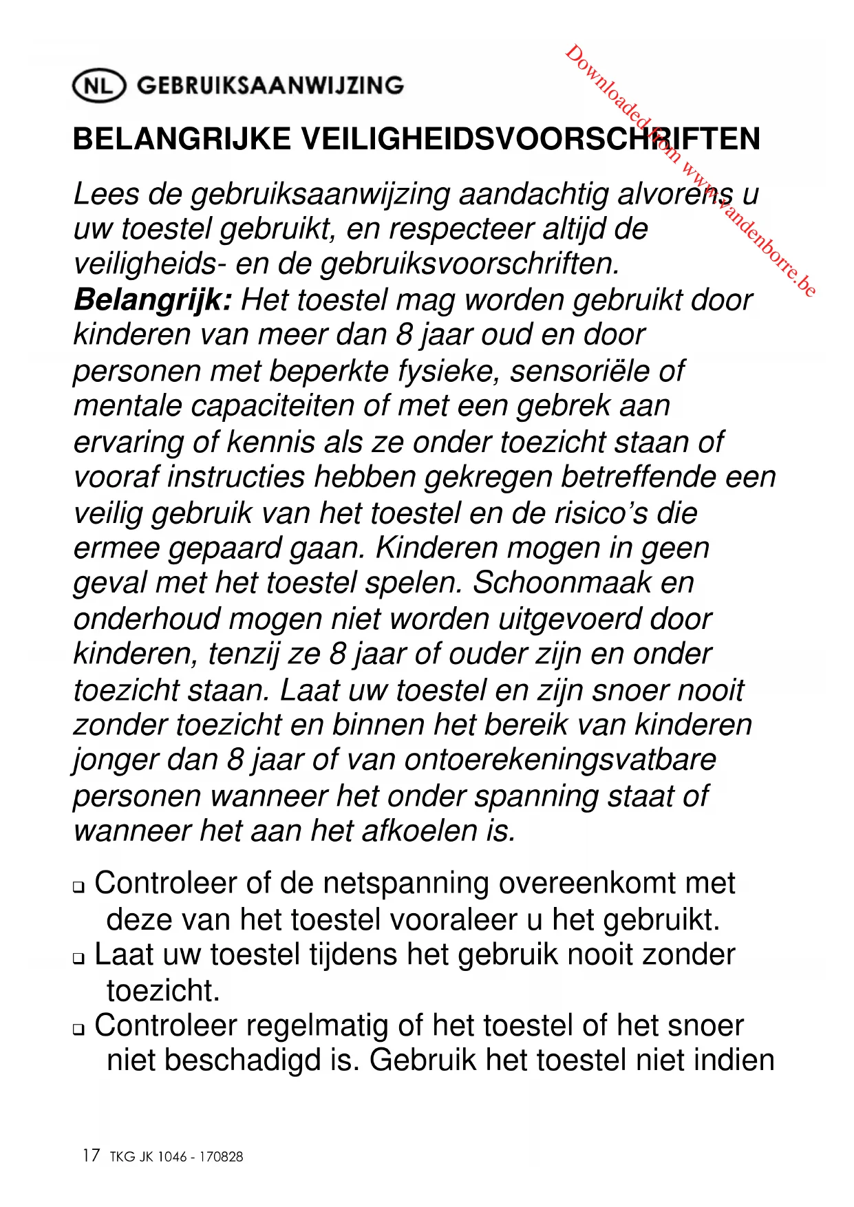 Fax +32 2 359 95 50 BELANGRIJKE VEILIGHEIDSVOORSCHRIFTEN Lees de gebruiksaanwijzing aandachtig alvorens u uw toestel gebruikt, en respecteer altijd de veiligheids- en de gebruiksvoorschriften. Belangrijk: Het toestel mag worden gebruikt door kinderen van meer dan 8 jaar oud en door personen met beperkte fysieke, sensoriële of mentale capaciteiten of met een gebrek aan ervaring of kennis als ze onder toezicht staan of vooraf instructies hebben gekregen betreffende een veilig gebruik van het toestel en de risico’s die ermee gepaard gaan. Kinderen mogen in geen geval met het toestel spelen. Schoonmaak en onderhoud mogen niet worden uitgevoerd door kinderen, tenzij ze 8 jaar of ouder zijn en onder toezicht staan. Laat uw toestel en zijn snoer nooit zonder toezicht en binnen het bereik van kinderen jonger dan 8 jaar of van ontoerekeningsvatbare personen wanneer het onder spanning staat of wanneer het aan het afkoelen is. Controleer of de netspanning overeenkomt met deze van het toestel vooraleer u het gebruikt. Laat uw toestel tijdens het gebruik nooit zonder toezicht. Controleer regelmatig of het toestel of het snoer niet beschadigd is. Gebruik het toestel niet indien Downloaded from www.vandenborre.be Copies of the I/B. Please reproduce them without any changes except under special instruction from Team International BELGIUM. The pages must be reproduced and folded in order to obtain a booklet A5 (+/- 148.5 mm width x 210 mm height). When folding, make sure you keep the good numbering when you turn the pages of the I/B. Don’t change the page numbering. Keep the language integrity.