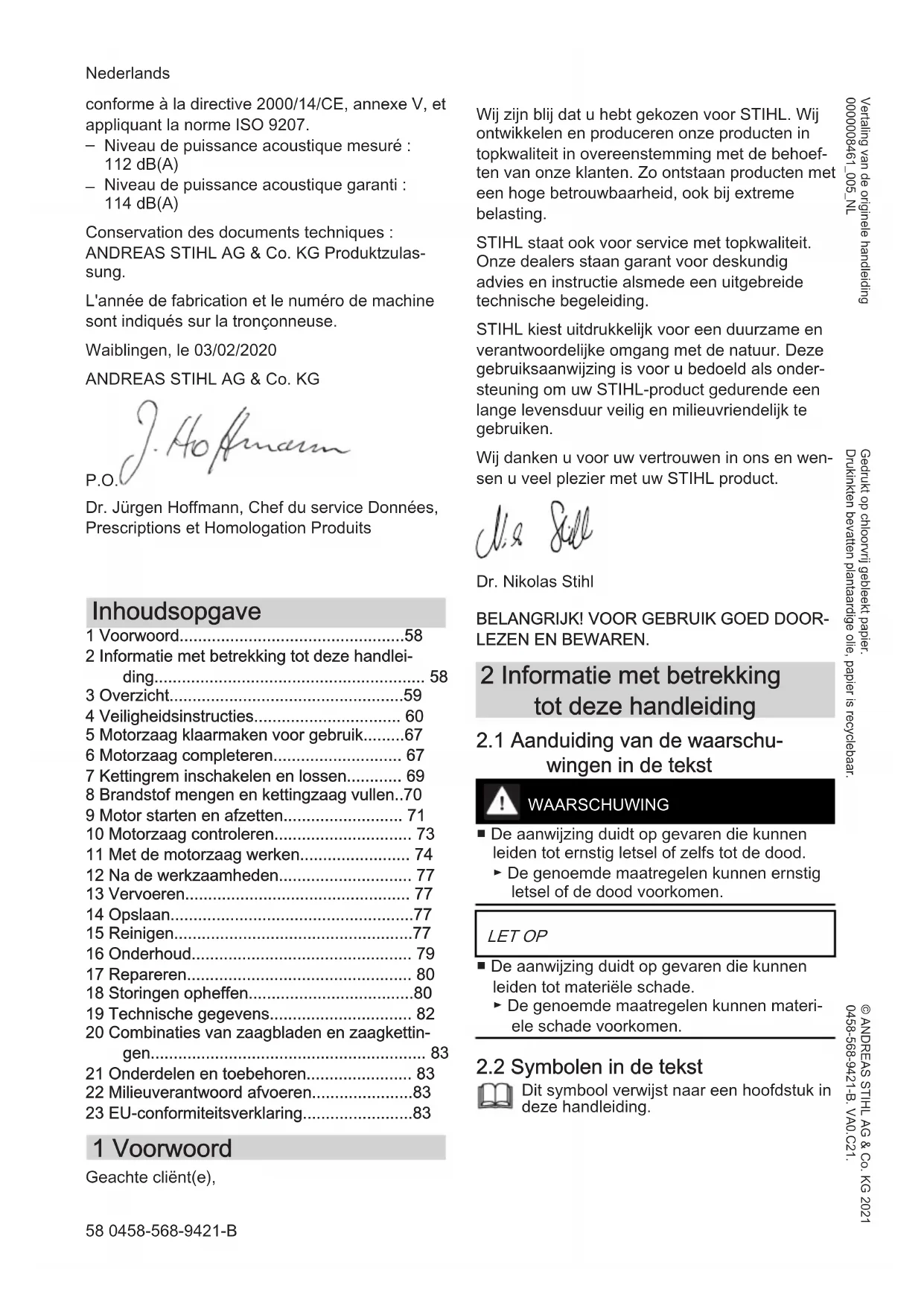 - Niveau de puissance acoustique garanti : 114 dB(A) Conservation des documents techniques : ANDREAS STIHL AG & Co. KG Produktzulas‐ sung. L'année de fabrication et le numéro de machine sont indiqués sur la tronçonneuse. Waiblingen, le 03/02/2020 ANDREAS STIHL AG & Co. KG P.O. Dr. Jürgen Hoffmann, Chef du service Données, Prescriptions et Homologation Produits Inhoudsopgave 1 Voorwoord p. 58