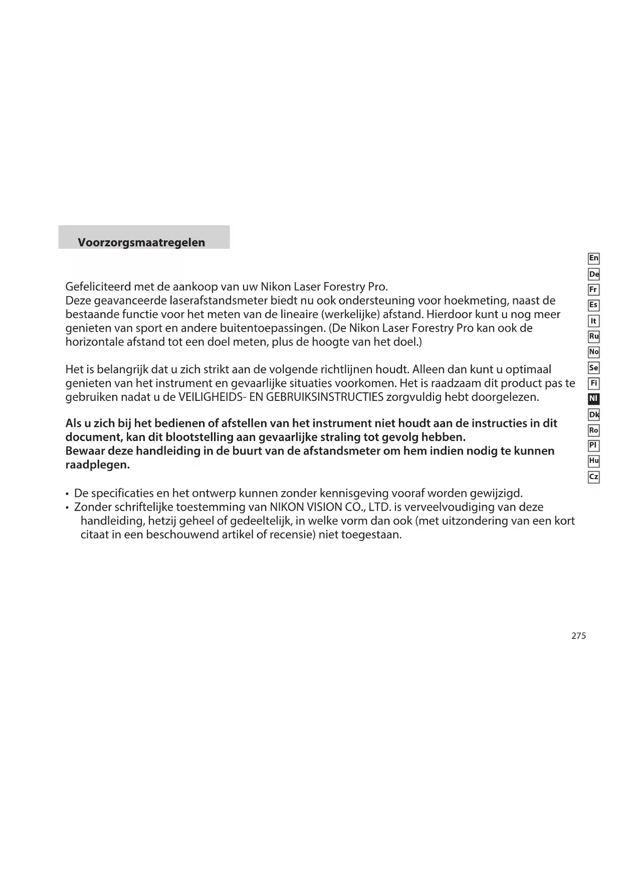 Voorzorgsmaatregelen Gefeliciteerd met de aankoop van uw Nikon Laser Forestry Pro. Deze geavanceerde laserafstandsmeter biedt nu ook ondersteuning voor hoekmeting, naast de bestaande functie voor het meten van de lineaire (werkelijke) afstand. Hierdoor kunt u nog meer genieten van sport en andere buitentoepassingen. (De Nikon Laser Forestry Pro kan ook de horizontale afstand tot een doel meten, plus de hoogte van het doel.) Het is belangrijk dat u zich strikt aan de volgende richtlijnen houdt. Alleen dan kunt u optimaal genieten van het instrument en gevaarlijke situaties voorkomen. Het is raadzaam dit product pas te gebruiken nadat u de VEILIGHEIDS- EN GEBRUIKSINSTRUCTIES zorgvuldig hebt doorgelezen. Als u zich bij het bedienen of afstellen van het instrument niet houdt aan de instructies in dit document, kan dit blootstelling aan gevaarlijke straling tot gevolg hebben. Bewaar deze handleiding in de buurt van de afstandsmeter om hem indien nodig te kunnen raadplegen.