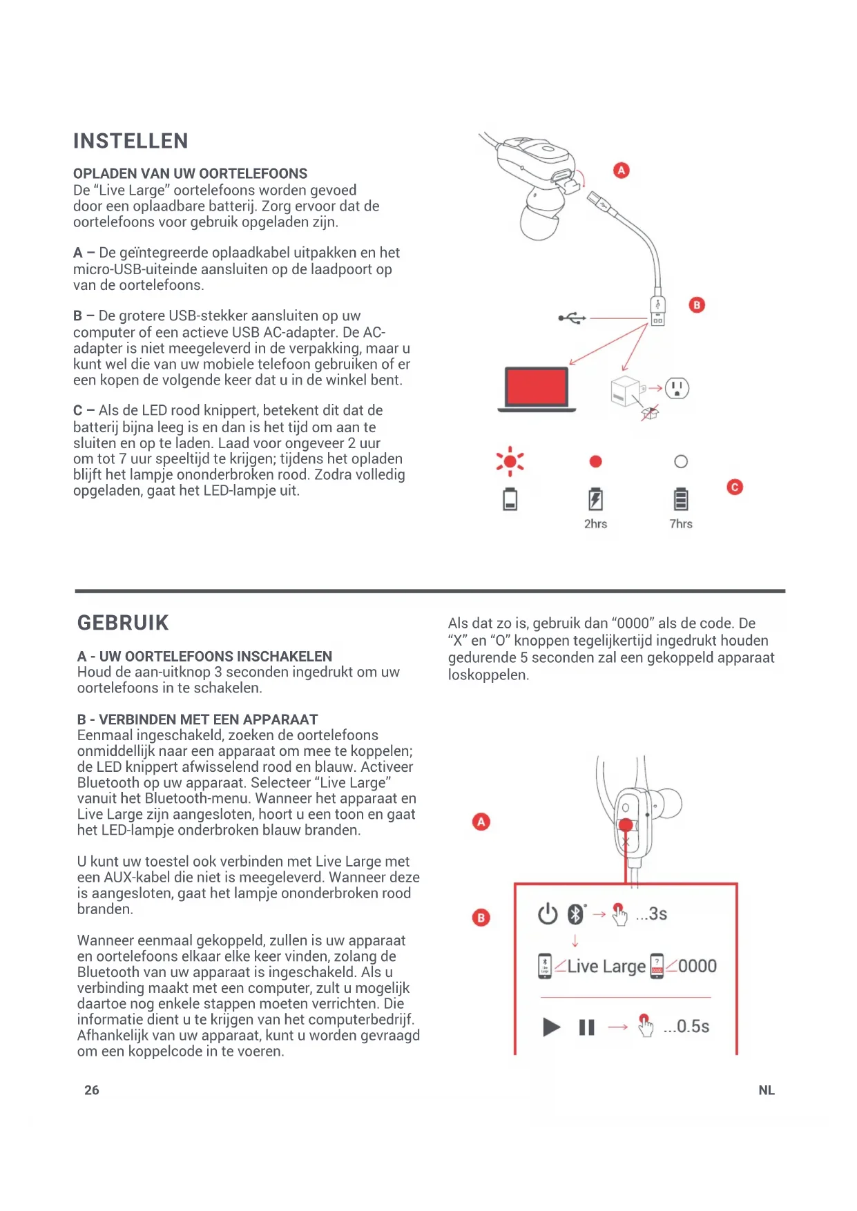 De “Live Large” oortelefoons worden gevoed door een oplaadbare batterij. Zorg ervoor dat de oortelefoons voor gebruik opgeladen zijn. A – De geïntegreerde oplaadkabel uitpakken en het micro-USB-uiteinde aansluiten op de laadpoort op van de oortelefoons. B – De grotere USB-stekker aansluiten op uw computer of een actieve USB AC-adapter. De AC- adapter is niet meegeleverd in de verpakking, maar u kunt wel die van uw mobiele telefoon gebruiken of er een kopen de volgende keer dat u in de winkel bent. C – Als de LED rood knippert, betekent dit dat de batterij bijna leeg is en dan is het tijd om aan te sluiten en op te laden. Laad voor ongeveer 2 uur om tot 7 uur speeltijd te krijgen; tijdens het opladen blijft het lampje ononderbroken rood. Zodra volledig opgeladen, gaat het LED-lampje uit. Als dat zo is, gebruik dan “0000” als de code. De “X” en “O” knoppen tegelijkertijd ingedrukt houden gedurende 5 seconden zal een gekoppeld apparaat loskoppelen. GEBRUIK