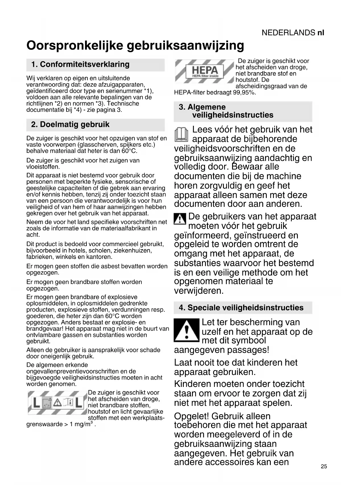 Oorspronkelijke gebruiksaanwijzing Wij verklaren op eigen en uitsluitende verantwoording dat: deze afzuigapparaten, geïdentificeerd door type en serienummer *1), voldoen aan alle relevante bepalingen van de richtlijnen *2) en normen *3). Technische documentatie bij *4) - zie pagina 3. De zuiger is geschikt voor het opzuigen van stof en vaste voorwerpen (glasscherven, spijkers etc.) behalve materiaal dat heter is dan 60°C. De zuiger is geschikt voor het zuigen van vloeistoffen. Dit apparaat is niet bestemd voor gebruik door personen met beperkte fysieke, sensorische of geestelijke capaciteiten of die gebrek aan ervaring en/of kennis hebben, tenzij zij onder toezicht staan van een persoon die verantwoordelijk is voor hun veiligheid of van hem of haar aanwijzingen hebben gekregen over het gebruik van het apparaat. Neem de voor het land specifieke voorschriften net zoals de informatie van de materiaalfabrikant in acht. Dit product is bedoeld voor commercieel gebruikt, bijvoorbeeld in hotels, scholen, ziekenhuizen, fabrieken, winkels en kantoren. Er mogen geen stoffen die asbest bevatten worden opgezogen. Er mogen geen brandbare stoffen worden opgezogen. Er mogen geen brandbare of explosieve oplosmiddelen, in oplosmiddelen gedrenkte producten, explosieve stoffen, verdunningen resp. goederen, die heter zijn dan 60°C worden opgezogen. Anders bestaat er explosie- en brandgevaar! Het apparaat mag niet in de buurt van ontvlambare gassen en substanties worden gebruikt. Alleen de gebruiker is aansprakelijk voor schade door oneigenlijk gebruik. De algemeen erkende ongevallenpreventievoorschriften en de bijgevoegde veiligheidsinstructies moeten in acht worden genomen. De zuiger is geschikt voor het afscheiden van droge, niet brandbare stoffen, houtstof en licht gevaarlijke stoffen met een werkplaats- grenswaarde > 1 mg/m³ . De zuiger is geschikt voor het afscheiden van droge, niet brandbare stof en houtstof. De afscheidingsgraad van de HEPA-filter bedraagt 99,95%. Lees vóór het gebruik van het apparaat de bijbehorende veiligheidsvoorschriften en de gebruiksaanwijzing aandachtig en volledig door. Bewaar alle documenten die bij de machine horen zorgvuldig en geef het apparaat alleen samen met deze documenten door aan anderen. De gebruikers van het apparaat moeten vóór het gebruik geïnformeerd, geïnstrueerd en opgeleid te worden omtrent de omgang met het apparaat, de substanties waarvoor het bestemd is en een veilige methode om het opgenomen materiaal te verwijderen. Let ter bescherming van uzelf en het apparaat op de met dit symbool aangegeven passages! Laat nooit toe dat kinderen het apparaat gebruiken. Kinderen moeten onder toezicht staan om ervoor te zorgen dat zij niet met het apparaat spelen. Opgelet! Gebruik alleen toebehoren die met het apparaat worden meegeleverd of in de gebruiksaanwijzing staan aangegeven. Het gebruik van andere accessoires kan een