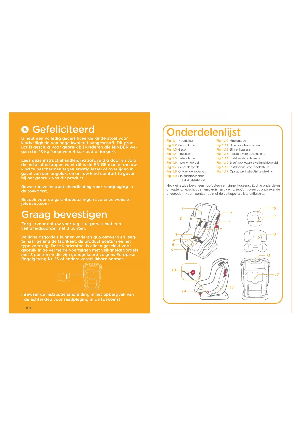 Onderdelenlijst Het kleine zitje bevat een hoofdsteun en binnenkussens. Zachte onderdelen omvatten zitje, schouderriem, kruisriem, klein zitje. Controleer op ontbrekende onderdelen. Neem contact op met de verkoper als iets ontbreekt. Fig. 1.1 HoofdsteunFig. 1.2 SchouderriemFig. 1.3 GespFig. 1.4 KruisriemFig. 1.5 InsteladapterFig. 1.6 Instellen gordelFig. 1.7 SchoudergordelFig. 1.8 OntgrendelapparaatFig. 1.9 Sleufachterwaartse veiligheidsgordelFig. 1.10 HoofdsteunFig. 1.11 Sleuf voor hoofdsteun Fig. 1.12 BinnenkussensFig. 1.13 Indicatie voor schuinstandFig. 1.14 Instelhendel schuinstandFig. 1.15 Sleuf voorwaartse veiligheidsgordelFig. 1.16 Instelhendel voor hoofdsteunFig. 1.17 Opslagvak instructiehandleiding101 102
