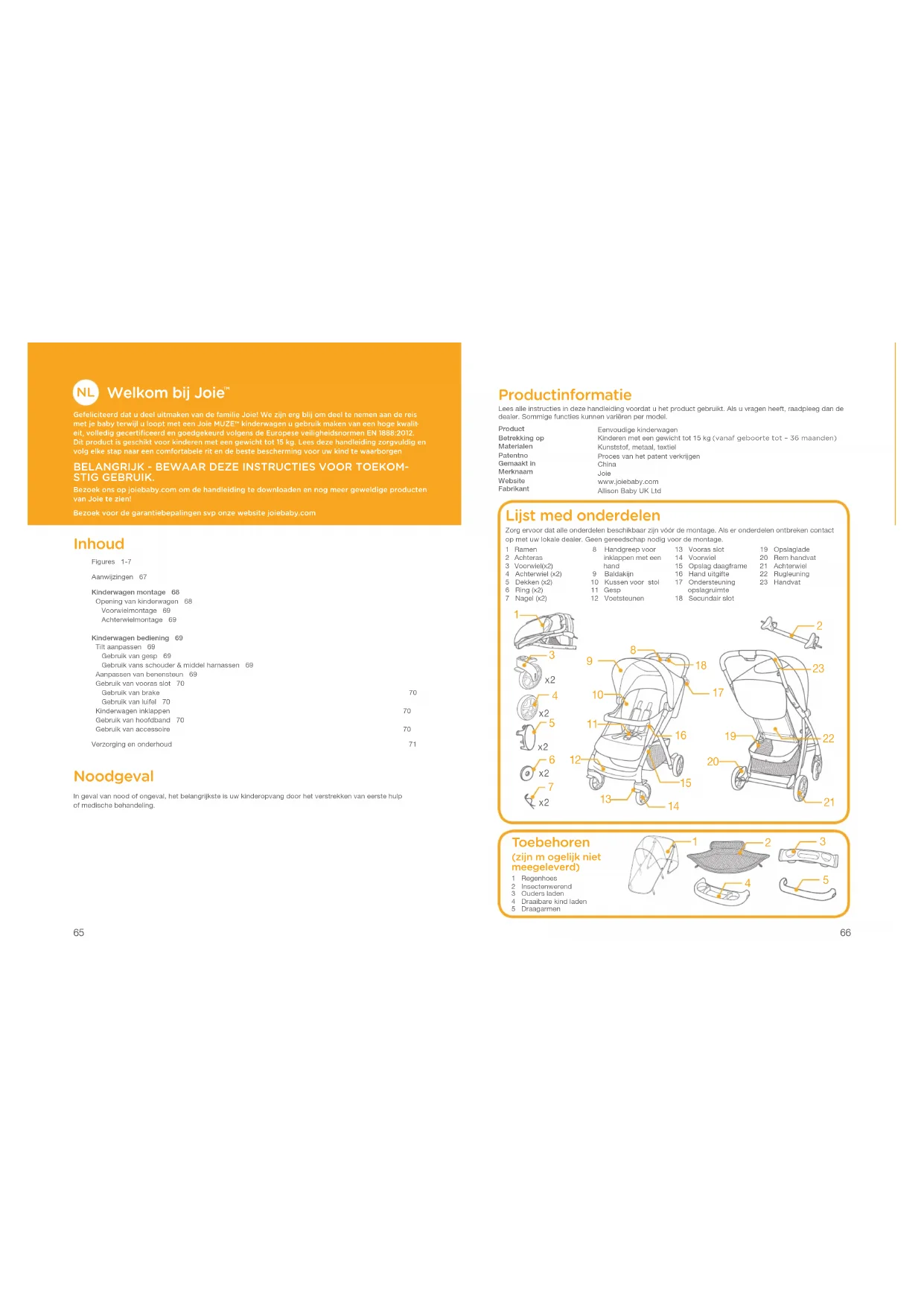 Gefeliciteerd dat u deel uitmaken van de familie Joie! We zijn erg blij om deel te nemen aan de reis met je baby terwijl u loopt met een Joie MUZE™ kinderwagen u gebruik maken van een hoge kwalit eit, volledig gecertificeerd en goedgekeurd volgens de Europese veiligheidsnormen EN 1888:2012. Dit product is geschikt voor kinderen met een gewicht tot 15 kg. Lees deze handleiding zorgvuldig en volg elke stap naar een comfortabele rit en de beste bescherming voor uw kind te waarborgenBELANGRIJK - BEWAAR DEZE INSTRUCTIES VOOR TOEKOM-STIG GEBRUIK. Bezoek ons op joiebaby.com om de handleiding te downloaden en nog meer geweldige producten van Joie te zien!Bezoek voor de garantiebepalingen svp onze website joiebaby.com Inhoud Figures 1-7Aanwijzingen 67Kinderwagen montage 68 Opening van kinderwagen 68 Voorwielmontage 69 Achterwielmontage 69 Kinderwagen bediening 69 Tilt aanpassen 69 Gebruik van gesp 69 Gebruik vans schouder & middel harnassen 69 Aanpassen van benensteun 69 Gebruik van vooras slot 70 Gebruik van brake 70 Gebruik van luifel 70 Kinderwagen inklappen 70 Gebruik van hoofdband 70 Gebruik van accessoire 70Verzorging en onderhoud 71 Noodgeval In geval van nood of ongeval, het belangrijkste is uw kinderopvang door het verstrekken van eerste hulp of medische behandeling. Productinformatie Lees alle instructies in deze handleiding voordat u het product gebruikt. Als u vragen heeft, raadpleeg dan de dealer. Sommige functies kunnen variëren per model.ProductBetrekking opMaterialen Patentno Gemaakt inMerknaam WebsiteFabrikant Toebehoren (zijn m ogelijk niet meegeleverd)1 Regenhoes2 Insectenwerend3 Ouders laden4 Draaibare kind laden5 Draagarmen1 Ramen2 Achteras3 Voorwiel(x2)4 Achterwiel (x2) 5 Dekken (x2)6 Ring (x2)7 Nagel (x2) 8 Handgreep voor inklappen met een hand 9 Baldakijn10 Kussen voor stol 11 Gesp12 Voetsteunen13 Vooras slot14 Voorwiel15 Opslag daagframe16 Hand uitgifte17 Ondersteuning opslagruimte 18 Secundair slot19 Opslaglade20 Rem handvat21 Achterwiel22 Rugleuning23 Handvat Lijst med onderdelen Zorg ervoor dat alle onderdelen beschikbaar zijn vóór de montage. Als er onderdelen ontbreken contact op met uw lokale dealer. Geen gereedschap nodig voor de montage.Eenvoudige kinderwagenKinderen met een gewicht tot 15 kg (vanaf geboorte tot – 36 maanden)Kunststof, metaal, textielProces van het patent verkrijgen China Joie www.joiebaby.comAllison Baby UK Ltd