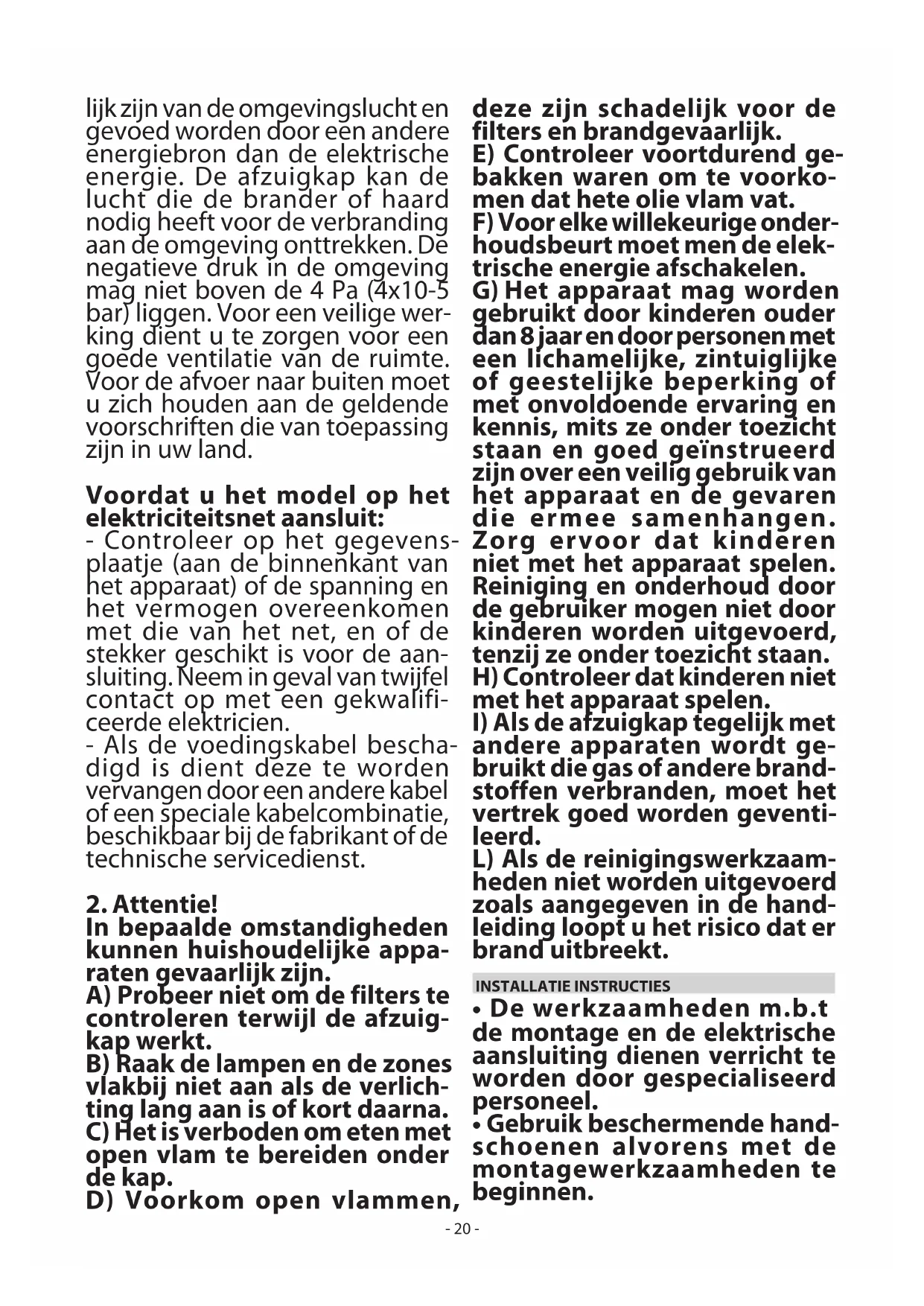 In bepaalde omstandigheden kunnen huishoudelijke appa- raten gevaarlijk zijn. A) Probeer niet om de filters te controleren terwijl de afzuig- kap werkt. B) Raak de lampen en de zones vlakbij niet aan als de verlich- ting lang aan is of kort daarna. C) Het is verboden om eten met open vlam te bereiden onder de kap. D) Voorkom open vlammen, deze zijn schadelijk voor de filters en brandgevaarlijk. E) Controleer voortdurend ge- bakken waren om te voorko- men dat hete olie vlam vat. F) Voor elke willekeurige onder- houdsbeurt moet men de elek- trische energie afschakelen. G) Het apparaat mag worden gebruikt door kinderen ouder dan 8 jaar en door personen met een lichamelijke, zintuiglijke of geestelijke beperking of met onvoldoende ervaring en kennis, mits ze onder toezicht staan en goed geïnstrueerd zijn over een veilig gebruik van het apparaat en de gevaren die ermee samenhangen. Zorg ervoor dat kinderen niet met het apparaat spelen. Reiniging en onderhoud door de gebruiker mogen niet door kinderen worden uitgevoerd, tenzij ze onder toezicht staan. H) Controleer dat kinderen niet met het apparaat spelen.