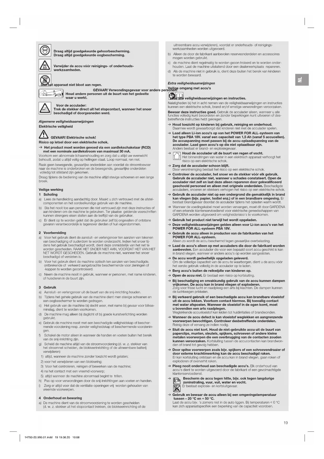 dichte en vorstbestendige plaats op. Afvoeren: (conform RL2012/19/EU) Het product mag niet met het normale huishoudelijke afval worden afgevoerd. Het moet volgens de geldende lokale milieuvoorschriften worden afgevoerd. BELANGRIJK! v Voer het product via uw plaatselijke recyclingverzamelpunt af. Accu afvoeren: Li-ion De GARDENA accu bevat lithium-ioncellen die aan het eind van hun levensduur gescheiden van het normale huishoudelijke afval moeten worden afgevoerd. BELANGRIJK! v Voer de accu’s via uw plaatselijke recyclingverzamelpunt af. 14700-20.960.01.indd 21 19.08.20 10:08NL