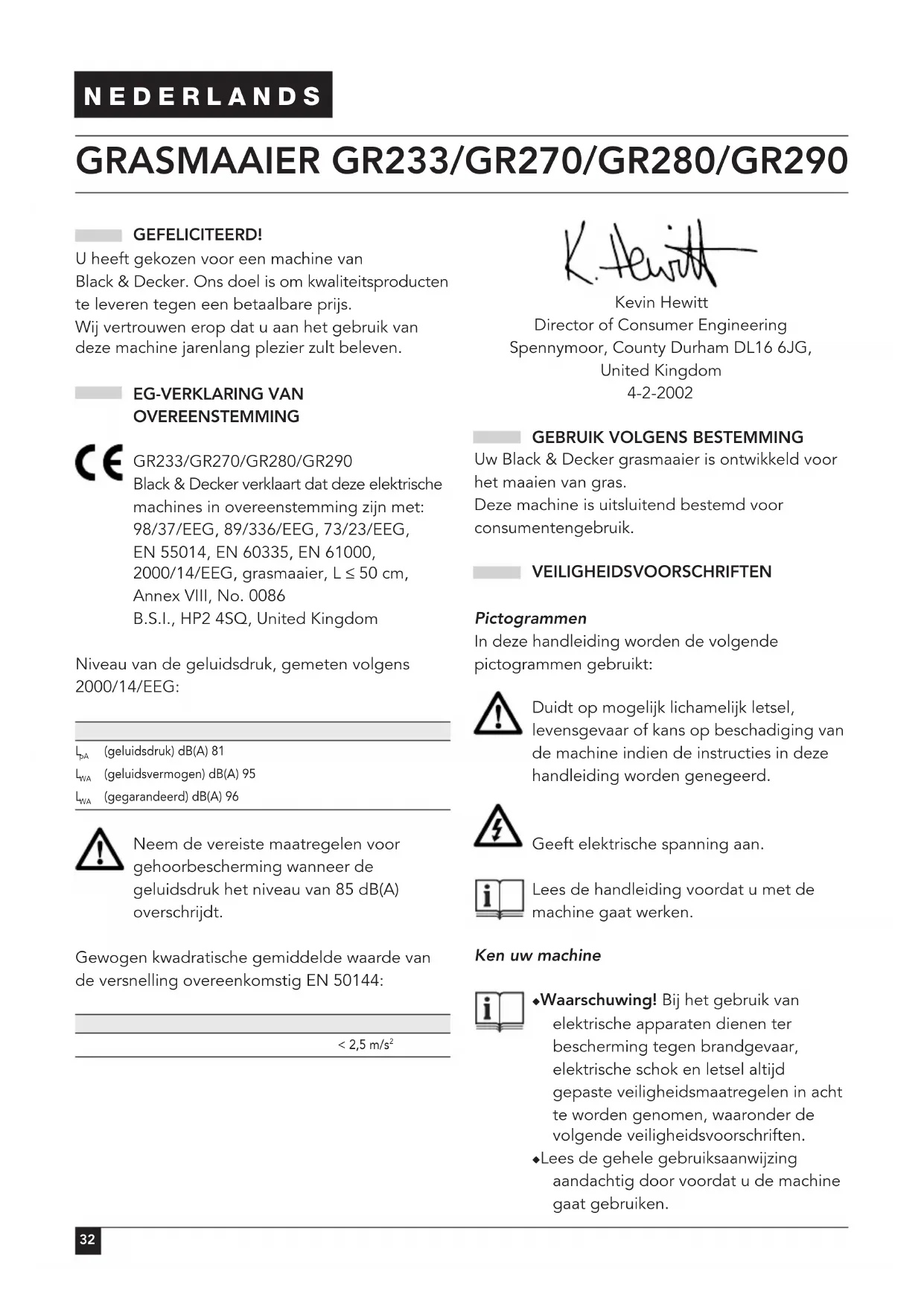 GEFELICITEERD! U heeft gekozen voor een machine van Black & Decker. Ons doel is om kwaliteitsproducten te leveren tegen een betaalbare prijs. Wij vertrouwen erop dat u aan het gebruik van deze machine jarenlang plezier zult beleven. EG-VERKLARING VAN OVEREENSTEMMING GR233/GR270/GR280/GR290 Black & Decker verklaart dat deze elektrische machines in overeenstemming zijn met: 98/37/EEG, 89/336/EEG, 73/23/EEG, EN 55014, EN 60335, EN 61000, 2000/14/EEG, grasmaaier, L ≤ 50 cm, Annex VIII, No. 0086 B.S.I., HP2 4SQ, United Kingdom Niveau van de geluidsdruk, gemeten volgens 2000/14/EEG: