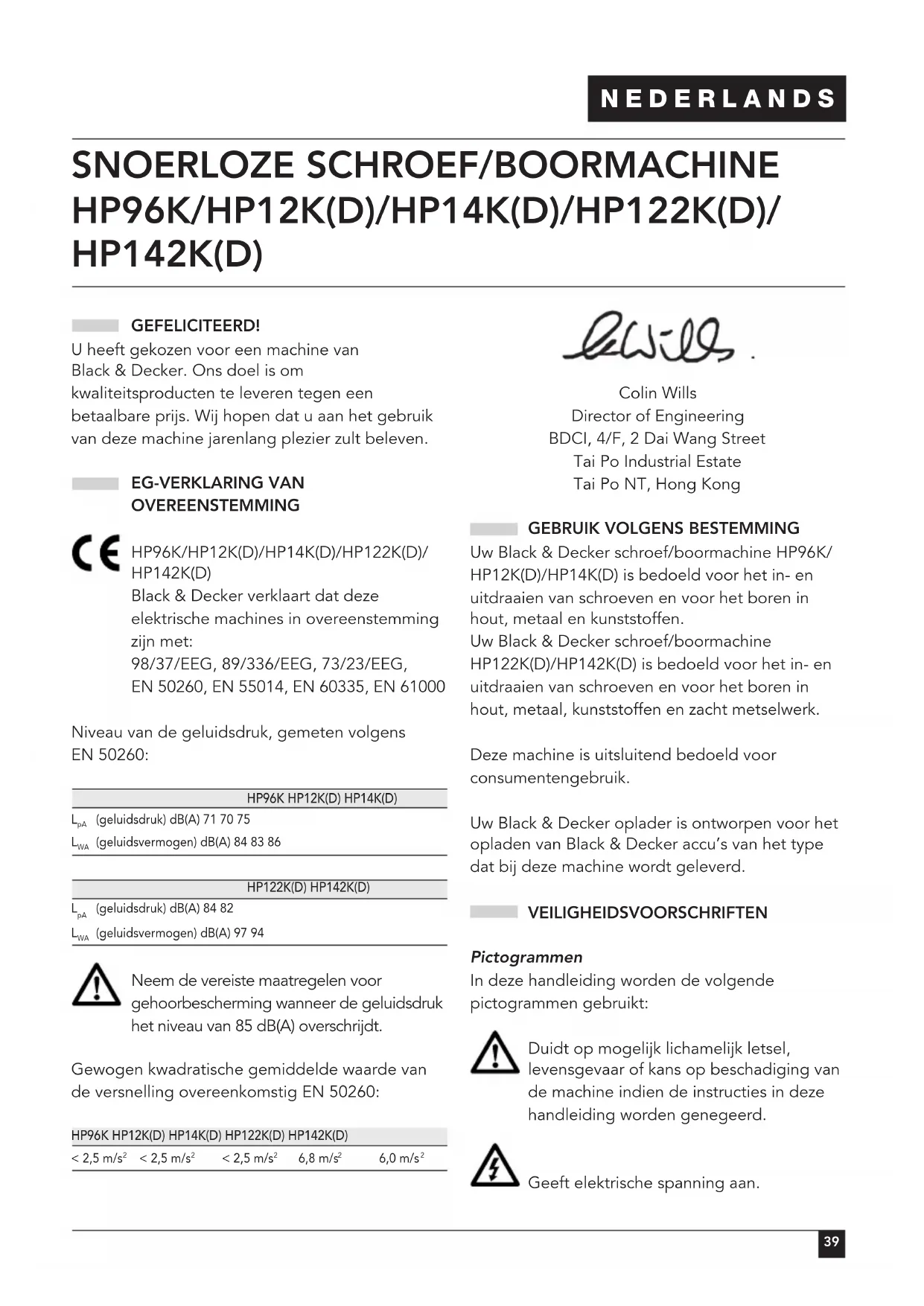 HP96K/HP12K(D)/HP14K(D)/HP122K(D)/ HP142K(D) GEFELICITEERD! U heeft gekozen voor een machine van Black & Decker. Ons doel is om kwaliteitsproducten te leveren tegen een betaalbare prijs. Wij hopen dat u aan het gebruik van deze machine jarenlang plezier zult beleven. EG-VERKLARING VAN OVEREENSTEMMING HP96K/HP12K(D)/HP14K(D)/HP122K(D)/ HP142K(D) Black & Decker verklaart dat deze elektrische machines in overeenstemming zijn met: 98/37/EEG, 89/336/EEG, 73/23/EEG, EN 50260, EN 55014, EN 60335, EN 61000 Niveau van de geluidsdruk, gemeten volgens EN 50260: HP96K HP12K(D) HP14K(D)