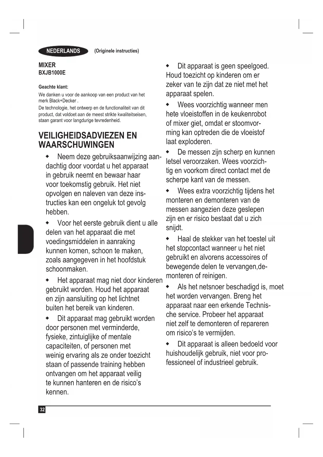 MIXER BXJB1000E Geachte klant: We danken u voor de aankoop van een product van het merk Black+Decker . De technologie, het ontwerp en de functionaliteit van dit product, dat voldoet aan de meest strikte kwaliteitseisen, staan garant voor langdurige tevredenheid. VEILIGHEIDSADVIEZEN EN WAARSCHUWINGEN Neem deze gebruiksaanwijzing aan- dachtig door voordat u het apparaat in gebruik neemt en bewaar haar voor toekomstig gebruik. Het niet opvolgen en naleven van deze ins- tructies kan een ongeluk tot gevolg hebben. Voor het eerste gebruik dient u alle delen van het apparaat die met voedingsmiddelen in aanraking kunnen komen, schoon te maken, zoals aangegeven in het hoofdstuk schoonmaken. Het apparaat mag niet door kinderen gebruikt worden. Houd het apparaat en zijn aansluiting op het lichtnet buiten het bereik van kinderen. Dit apparaat mag gebruikt worden door personen met verminderde, fysieke, zintuiglijke of mentale capaciteiten, of personen met weinig ervaring als ze onder toezicht staan of passende training hebben ontvangen om het apparaat veilig te kunnen hanteren en de risico’s kennen. Dit apparaat is geen speelgoed. Houd toezicht op kinderen om er zeker van te zijn dat ze niet met het apparaat spelen. Wees voorzichtig wanneer men hete vloeistoffen in de keukenrobot of mixer giet, omdat er stoomvor- ming kan optreden die de vloeistof laat exploderen. De messen zijn scherp en kunnen letsel veroorzaken. Wees voorzich- tig en voorkom direct contact met de scherpe kant van de messen. Wees extra voorzichtig tijdens het monteren en demonteren van de messen aangezien deze geslepen zijn en er risico bestaat dat u zich snijdt. Haal de stekker van het toestel uit het stopcontact wanneer u het niet gebruikt en alvorens accessoires of bewegende delen te vervangen,de- monteren of reinigen. Als het netsnoer beschadigd is, moet het worden vervangen. Breng het apparaat naar een erkende Technis- che service. Probeer het apparaat niet zelf te demonteren of repareren om risico’s te vermijden. Dit apparaat is alleen bedoeld voor huishoudelijk gebruik, niet voor pro- fessioneel of industrieel gebruik.NEDERLANDS (Originele instructies)