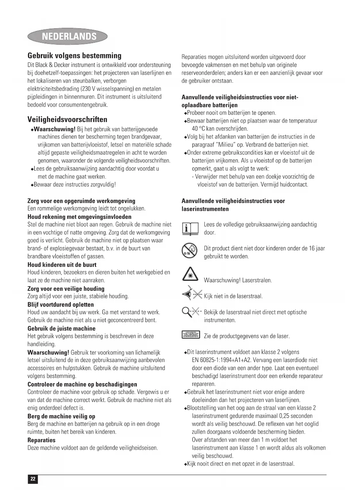 Kevin Hewitt Direttore di Ricerca e Sviluppo Spennymoor, County Durham DL16 6JG, United Kingdom 1-2-2006 Garanzia Certa della qualità dei suoi prodotti, Black & Decker offre una garanzia eccezionale. Il presente certificato di garanzia è complementare ai diritti statutari e non li pregiudica in alcun modo. La garanzia è valida entro il territorio degli Stati membri dell’Unione Europea e dell’EFTA (European Free Trade Area). Se un prodotto Black & Decker risulta difettoso per qualità del materiale, della costruzione o per mancata conformità entro 24 mesi dalla data di acquisto, Black & Decker garantisce la sostituzione delle parti difettose, provvede alla riparazione dei prodotti se ragionevolmente usurati oppure alla loro sostituzione, in modo da ridurre al minimo il disagio del cliente a meno che: ◆ Il prodotto non sia stato destinato ad usi commerciali, professionali o al noleggio; ◆ Il prodotto non sia stato usato in modo improprio o scorretto; ◆ Il prodotto non abbia subito danni causati da oggetti o sostanze estranee oppure incidenti; ◆ Il prodotto non abbia subito tentativi di riparazione non effettuati da tecnici autorizzati né dall’assistenza Black & Decker.21 ITALIANO Per attivare la garanzia è necessario esibire la prova comprovante l’acquisto al venditore o al tecnico autorizzato. Per individuare il tecnico autorizzato più vicino, rivolgersi alla sede Black & Decker locale, presso il recapito indicato nel presente manuale. Altrimenti un elenco completo di tutti i tecnici autorizzati Black & Decker e i dettagli completi sui contatti e i servizi post-vendita sono disponibili su Internet presso: www.2helpU.com I clienti che desiderano registrare il nuovo prodotto Black & Decker e ricevere gli aggiornamenti sui nuovi prodotti e le offerte speciali, sono invitati a visitare il sito Web (www.blackanddecker.it). Ulteriori informazioni sul marchio e la gamma di prodotti Black & Decker sono disponibili all’indirizzo www.blackanddecker.it22 NEDERLANDS Gebruik volgens bestemming Dit Black & Decker instrument is ontwikkeld voor ondersteuning bij doehetzelf-toepassingen: het projecteren van laserlijnen en het lokaliseren van steunbalken, verborgen elektriciteitsbedrading (230 V wisselspanning) en metalen pijpleidingen in binnenmuren. Dit instrument is uitsluitend bedoeld voor consumentengebruik. Veiligheidsvoorschriften ◆ Waarschuwing! Bij het gebruik van batterijgevoede machines dienen ter bescherming tegen brandgevaar, vrijkomen van batterijvloeistof, letsel en materiële schade altijd gepaste veiligheidsmaatregelen in acht te worden genomen, waaronder de volgende veiligheidsvoorschriften. ◆ Lees de gebruiksaanwijzing aandachtig door voordat u met de machine gaat werken. ◆ Bewaar deze instructies zorgvuldig! Zorg voor een opgeruimde werkomgeving Een rommelige werkomgeving leidt tot ongelukken. Houd rekening met omgevingsinvloeden Stel de machine niet bloot aan regen. Gebruik de machine niet in een vochtige of natte omgeving. Zorg dat de werkomgeving goed is verlicht. Gebruik de machine niet op plaatsen waar brand- of explosiegevaar bestaat, b.v. in de buurt van brandbare vloeistoffen of gassen. Houd kinderen uit de buurt Houd kinderen, bezoekers en dieren buiten het werkgebied en laat ze de machine niet aanraken. Zorg voor een veilige houding Zorg altijd voor een juiste, stabiele houding. Blijf voortdurend opletten Houd uw aandacht bij uw werk. Ga met verstand te werk. Gebruik de machine niet als u niet geconcentreerd bent. Gebruik de juiste machine Het gebruik volgens bestemming is beschreven in deze handleiding. Waarschuwing! Gebruik ter voorkoming van lichamelijk letsel uitsluitend de in deze gebruiksaanwijzing aanbevolen accessoires en hulpstukken. Gebruik de machine uitsluitend volgens bestemming. Controleer de machine op beschadigingen Controleer de machine voor gebruik op schade. Vergewis u er van dat de machine correct werkt. Gebruik de machine niet als enig onderdeel defect is. Berg de machine veilig op Berg de machine en batterijen na gebruik op in een droge ruimte, buiten het bereik van kinderen. Reparaties Deze machine voldoet aan de geldende veiligheidseisen. Reparaties mogen uitsluitend worden uitgevoerd door bevoegde vakmensen en met behulp van originele reserveonderdelen; anders kan er een aanzienlijk gevaar voor de gebruiker ontstaan. Aanvullende veiligheidsinstructies voor niet- oplaadbare batterijen ◆ Probeer nooit om batterijen te openen. ◆ Bewaar batterijen niet op plaatsen waar de temperatuur 40 °C kan overschrijden. ◆ Volg bij het afdanken van batterijen de instructies in de paragraaf “Milieu” op. Verbrand de batterijen niet. ◆ Onder extreme gebruikscondities kan er vloeistof uit de batterijen vrijkomen. Als u vloeistof op de batterijen opmerkt, gaat u als volgt te werk: - Verwijder met behulp van een doekje voorzichtig de vloeistof van de batterijen. Vermijd huidcontact. Aanvullende veiligheidsinstructies voor laserinstrumenten Lees de volledige gebruiksaanwijzing aandachtig door. Dit product dient niet door kinderen onder de 16 jaar gebruikt te worden. Waarschuwing! Laserstralen. Kijk niet in de laserstraal. Bekijk de laserstraal niet direct met optische instrumenten. Zie de productgegevens van de laser. ◆ Dit laserinstrument voldoet aan klasse 2 volgens EN 60825-1:1994+A1+A2. Vervang een laserdiode niet door een diode van een ander type. Laat een eventueel beschadigd laserinstrument door een erkende reparateur repareren. ◆ Gebruik het laserinstrument niet voor enige andere doeleinden dan het projecteren van laserlijnen. ◆ Blootstelling van het oog aan de straal van een klasse 2 laserinstrument gedurende maximaal 0,25 seconden wordt als veilig beschouwd. De reflexen van het ooglid zullen doorgaans voldoende bescherming bieden. Over afstanden van meer dan 1 m voldoet het laserinstrument aan klasse 1 en wordt aldus als volkomen veilig beschouwd. ◆ Kijk nooit direct en met opzet in de laserstraal.23 NEDERLANDS ◆
