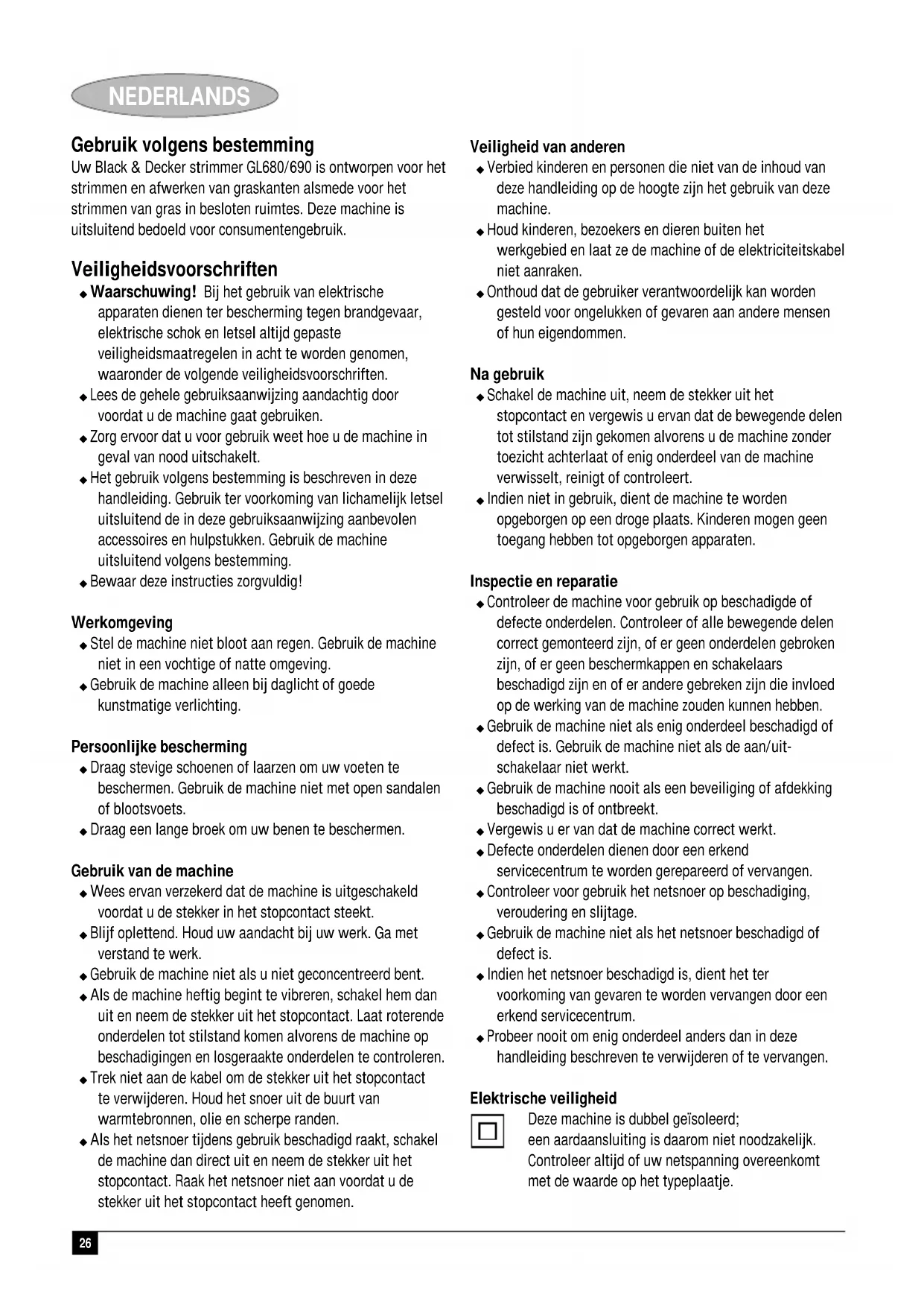 Kevin Hewitt Direttore tecnico prodotti di consumo Spennymoor, County Durham DL16 6JG, Regno Unito 01-10-2002 Garanzia Certa della qualità dei suoi prodotti, Black & Decker offre una garanzia eccezionale. Il presente certificato di garanzia è complementare ai diritti statutari e non li pregiudica in alcun modo. La garanzia è valida entro il territorio degli Stati membri dell’Unione Europea e dell’EFTA (European Free Trade Area). Se un prodotto Black & Decker risulta difettoso per qualità del materiale, della costruzione o per mancata conformità entro 24 mesi dalla data di acquisto, Black & Decker garantisce la sostituzione delle parti difettose, provvede alla riparazione dei prodotti se ragionevolmente usurati oppure alla loro sostituzione, in modo da ridurre al minimo il disagio del cliente a meno che: ◆ Il prodotto non sia stato destinato ad usi commerciali, professionali o al noleggio; ◆ Il prodotto non sia stato usato in modo improprio o scorretto; ◆ Il prodotto non abbia subito danni causati da oggetti o sostanze estranee oppure incidenti; ◆ Il prodotto non abbia subito tentativi di riparazione non effettuati da tecnici autorizzati né dall’assistenza Black & Decker. Per attivare la garanzia è necessario esibire la prova comprovante l’acquisto al venditore o al tecnico autorizzato. Per individuare il tecnico autorizzato più vicino, rivolgersi alla sede Black & Decker locale, presso il recapito indicato nel presente manuale. Altrimenti un elenco completo di tutti i tecnici autorizzati Black & Decker e i dettagli completi sui contatti e i servizi post-vendita sono disponibili su Internet presso: www.2helpU.com.26 NEDERLANDS Gebruik volgens bestemming Uw Black & Decker strimmer GL680/690 is ontworpen voor het strimmen en afwerken van graskanten alsmede voor het strimmen van gras in besloten ruimtes. Deze machine is uitsluitend bedoeld voor consumentengebruik. Veiligheidsvoorschriften ◆ Waarschuwing! Bij het gebruik van elektrische apparaten dienen ter bescherming tegen brandgevaar, elektrische schok en letsel altijd gepaste veiligheidsmaatregelen in acht te worden genomen, waaronder de volgende veiligheidsvoorschriften. ◆ Lees de gehele gebruiksaanwijzing aandachtig door voordat u de machine gaat gebruiken. ◆ Zorg ervoor dat u voor gebruik weet hoe u de machine in geval van nood uitschakelt. ◆ Het gebruik volgens bestemming is beschreven in deze handleiding. Gebruik ter voorkoming van lichamelijk letsel uitsluitend de in deze gebruiksaanwijzing aanbevolen accessoires en hulpstukken. Gebruik de machine uitsluitend volgens bestemming. ◆ Bewaar deze instructies zorgvuldig! Werkomgeving ◆ Stel de machine niet bloot aan regen. Gebruik de machine niet in een vochtige of natte omgeving. ◆ Gebruik de machine alleen bij daglicht of goede kunstmatige verlichting. Persoonlijke bescherming ◆ Draag stevige schoenen of laarzen om uw voeten te beschermen. Gebruik de machine niet met open sandalen of blootsvoets. ◆ Draag een lange broek om uw benen te beschermen. Gebruik van de machine ◆ Wees ervan verzekerd dat de machine is uitgeschakeld voordat u de stekker in het stopcontact steekt. ◆ Blijf oplettend. Houd uw aandacht bij uw werk. Ga met verstand te werk. ◆ Gebruik de machine niet als u niet geconcentreerd bent. ◆ Als de machine heftig begint te vibreren, schakel hem dan uit en neem de stekker uit het stopcontact. Laat roterende onderdelen tot stilstand komen alvorens de machine op beschadigingen en losgeraakte onderdelen te controleren. ◆ Trek niet aan de kabel om de stekker uit het stopcontact te verwijderen. Houd het snoer uit de buurt van warmtebronnen, olie en scherpe randen. ◆ Als het netsnoer tijdens gebruik beschadigd raakt, schakel de machine dan direct uit en neem de stekker uit het stopcontact. Raak het netsnoer niet aan voordat u de stekker uit het stopcontact heeft genomen. Veiligheid van anderen ◆ Verbied kinderen en personen die niet van de inhoud van deze handleiding op de hoogte zijn het gebruik van deze machine. ◆ Houd kinderen, bezoekers en dieren buiten het werkgebied en laat ze de machine of de elektriciteitskabel niet aanraken. ◆ Onthoud dat de gebruiker verantwoordelijk kan worden gesteld voor ongelukken of gevaren aan andere mensen of hun eigendommen. Na gebruik ◆ Schakel de machine uit, neem de stekker uit het stopcontact en vergewis u ervan dat de bewegende delen tot stilstand zijn gekomen alvorens u de machine zonder toezicht achterlaat of enig onderdeel van de machine verwisselt, reinigt of controleert. ◆ Indien niet in gebruik, dient de machine te worden opgeborgen op een droge plaats. Kinderen mogen geen toegang hebben tot opgeborgen apparaten. Inspectie en reparatie ◆ Controleer de machine voor gebruik op beschadigde of defecte onderdelen. Controleer of alle bewegende delen correct gemonteerd zijn, of er geen onderdelen gebroken zijn, of er geen beschermkappen en schakelaars beschadigd zijn en of er andere gebreken zijn die invloed op de werking van de machine zouden kunnen hebben. ◆ Gebruik de machine niet als enig onderdeel beschadigd of defect is. Gebruik de machine niet als de aan/uit- schakelaar niet werkt. ◆ Gebruik de machine nooit als een beveiliging of afdekking beschadigd is of ontbreekt. ◆ Vergewis u er van dat de machine correct werkt. ◆ Defecte onderdelen dienen door een erkend servicecentrum te worden gerepareerd of vervangen. ◆ Controleer voor gebruik het netsnoer op beschadiging, veroudering en slijtage. ◆ Gebruik de machine niet als het netsnoer beschadigd of defect is. ◆ Indien het netsnoer beschadigd is, dient het ter voorkoming van gevaren te worden vervangen door een erkend servicecentrum. ◆ Probeer nooit om enig onderdeel anders dan in deze handleiding beschreven te verwijderen of te vervangen. Elektrische veiligheid Deze machine is dubbel geïsoleerd; een aardaansluiting is daarom niet noodzakelijk. Controleer altijd of uw netspanning overeenkomt met de waarde op h