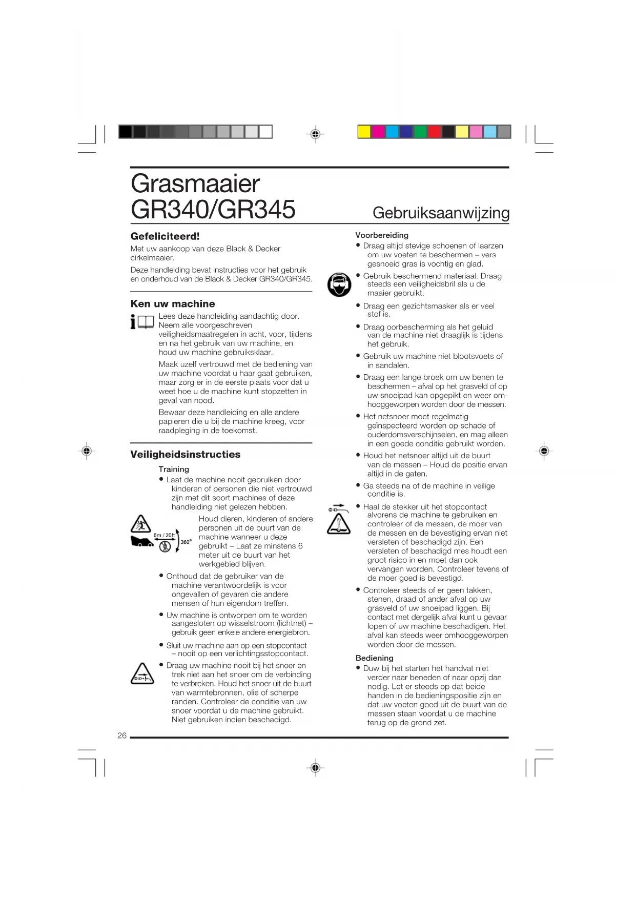 Brian Cooke Directeur du Développement Spennymoor, County Durham DL16 6JG, Royaume-Uni 1-12-2001 GR340_42_45ML.P6 28-11-2001, 15:282526 Gefeliciteerd! Met uw aankoop van deze Black & Decker cirkelmaaier. Deze handleiding bevat instructies voor het gebruik en onderhoud van de Black & Decker GR340/GR345. Ken uw machine Lees deze handleiding aandachtig door. Neem alle voorgeschreven veiligheidsmaatregelen in acht, voor, tijdens en na het gebruik van uw machine, en houd uw machine gebruiksklaar. Maak uzelf vertrouwd met de bediening van uw machine voordat u haar gaat gebruiken, maar zorg er in de eerste plaats voor dat u weet hoe u de machine kunt stopzetten in geval van nood. Bewaar deze handleiding en alle andere papieren die u bij de machine kreeg, voor raadpleging in de toekomst. Veiligheidsinstructies Training
