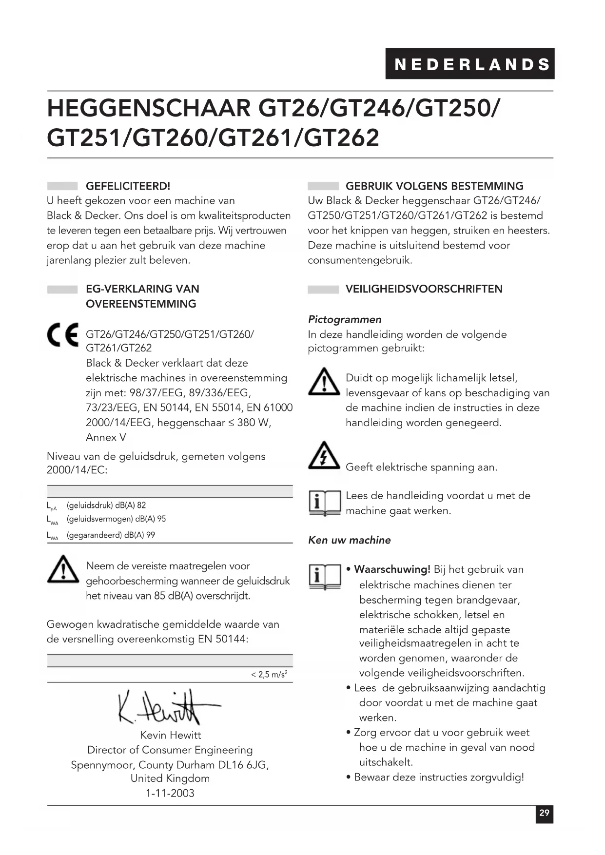 GT251/GT260/GT261/GT262 GEFELICITEERD! U heeft gekozen voor een machine van Black & Decker. Ons doel is om kwaliteitsproducten te leveren tegen een betaalbare prijs. Wij vertrouwen erop dat u aan het gebruik van deze machine jarenlang plezier zult beleven. EG-VERKLARING VAN OVEREENSTEMMING GT26/GT246/GT250/GT251/GT260/ GT261/GT262 Black & Decker verklaart dat deze elektrische machines in overeenstemming zijn met: 98/37/EEG, 89/336/EEG,