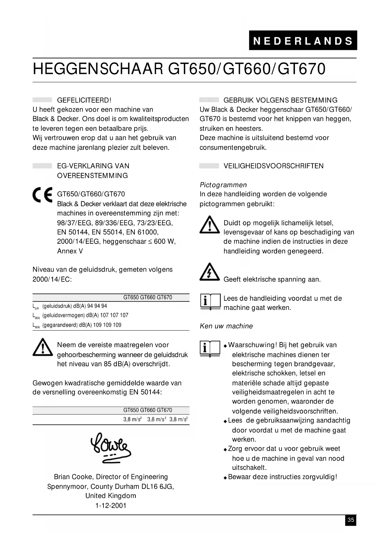 GEFELICITEERD! U heeft gekozen voor een machine van Black & Decker. Ons doel is om kwaliteitsproducten te leveren tegen een betaalbare prijs. Wij vertrouwen erop dat u aan het gebruik van deze machine jarenlang plezier zult beleven. EG-VERKLARING VAN OVEREENSTEMMING GT650/GT660/GT670 Black & Decker verklaart dat deze elektrische machines in overeenstemming zijn met: 98/37/EEG, 89/336/EEG, 73/23/EEG, EN 50144, EN 55014, EN 61000, 2000/14/EEG, heggenschaar ≤ 600 W, Annex V Niveau van de geluidsdruk, gemeten volgens 2000/14/EC: GT650 GT660 GT670