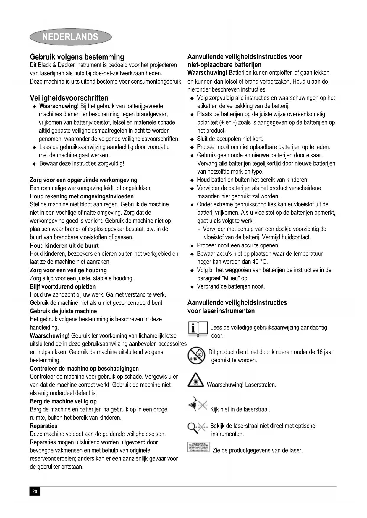 Kevin Hewitt Direttore di Ricerca e Sviluppo Spennymoor, County Durham DL16 6JG, United Kingdom 01-10-2006 Garanzia Certa della qualità dei suoi prodotti, Black & Decker offre una garanzia eccezionale. Il presente certificato di garanzia è complementare ai diritti statutari e non li pregiudica in alcun modo. La garanzia è valida entro il territorio degli Stati membri dell'Unione Europea e dell'EFTA (European Free Trade Area). Se un prodotto Black & Decker risulta difettoso per qualità del materiale, della costruzione o per mancata conformità entro 24 mesi dalla data di acquisto, Black & Decker garantisce la sostituzione delle parti difettose, provvede alla riparazione dei prodotti se ragionevolmente usurati oppure alla loro sostituzione, in modo da ridurre al minimo il disagio del cliente a meno che: Il prodotto non sia stato destinato ad usi commerciali, professionali o al noleggio; Il prodotto non sia stato usato in modo improprio o scorretto; Il prodotto non abbia subito danni causati da oggetti o sostanze estranee oppure incidenti; Il prodotto non abbia subito tentativi di riparazione non effettuati da tecnici autorizzati né dall'assistenza Black & Decker. Per attivare la garanzia è necessario esibire la prova comprovante l'acquisto al venditore o al tecnico autorizzato. Per individuare il tecnico autorizzato più vicino, rivolgersi alla sede Black & Decker locale, presso il recapito indicato nel presente manuale. Altrimenti un elenco completo di tutti i tecnici autorizzati Black & Decker e i dettagli completi sui contatti e i servizi post-vendita sono disponibili su Internet presso: www.2helpU.com I clienti che desiderano registrare il nuovo prodotto Black & Decker e ricevere gli aggiornamenti sui nuovi prodotti e le offerte speciali, sono invitati a visitare il sito Web (www.blackanddecker.it). Ulteriori informazioni sul marchio e la gamma di prodotti Black & Decker sono disponibili all'indirizzo www.blackanddecker.it20 NEDERLANDS Gebruik volgens bestemming Dit Black & Decker instrument is bedoeld voor het projecteren van laserlijnen als hulp bij doe-het-zelfwerkzaamheden. Deze machine is uitsluitend bestemd voor consumentengebruik. Veiligheidsvoorschriften Waarschuwing! Bij het gebruik van batterijgevoede machines dienen ter bescherming tegen brandgevaar, vrijkomen van batterijvloeistof, letsel en materiële schade altijd gepaste veiligheidsmaatregelen in acht te worden genomen, waaronder de volgende veiligheidsvoorschriften. Lees de gebruiksaanwijzing aandachtig door voordat u met de machine gaat werken. Bewaar deze instructies zorgvuldig! Zorg voor een opgeruimde werkomgeving Een rommelige werkomgeving leidt tot ongelukken. Houd rekening met omgevingsinvloeden Stel de machine niet bloot aan regen. Gebruik de machine niet in een vochtige of natte omgeving. Zorg dat de werkomgeving goed is verlicht. Gebruik de machine niet op plaatsen waar brand- of explosiegevaar bestaat, b.v. in de buurt van brandbare vloeistoffen of gassen. Houd kinderen uit de buurt Houd kinderen, bezoekers en dieren buiten het werkgebied en laat ze de machine niet aanraken. Zorg voor een veilige houding Zorg altijd voor een juiste, stabiele houding. Blijf voortdurend opletten Houd uw aandacht bij uw werk. Ga met verstand te werk. Gebruik de machine niet als u niet geconcentreerd bent. Gebruik de juiste machine Het gebruik volgens bestemming is beschreven in deze handleiding. Waarschuwing! Gebruik ter voorkoming van lichamelijk letsel uitsluitend de in deze gebruiksaanwijzing aanbevolen accessoires en hulpstukken. Gebruik de machine uitsluitend volgens bestemming. Controleer de machine op beschadigingen Controleer de machine voor gebruik op schade. Vergewis u er van dat de machine correct werkt. Gebruik de machine niet als enig onderdeel defect is. Berg de machine veilig op Berg de machine en batterijen na gebruik op in een droge ruimte, buiten het bereik van kinderen. Reparaties Deze machine voldoet aan de geldende veiligheidseisen. Reparaties mogen uitsluitend worden uitgevoerd door bevoegde vakmensen en met behulp van originele reserveonderdelen; anders kan er een aanzienlijk gevaar voor de gebruiker ontstaan. Aanvullende veiligheidsinstructies voor niet-oplaadbare batterijen Waarschuwing! Batterijen kunen ontploffen of gaan lekken en kunnen dan letsel of brand veroorzaken. Houd u aan de hieronder beschreven instructies. Volg zorgvuldig alle instructies en waarschuwingen op het etiket en de verpakking van de batterij. Plaats de batterijen op de juiste wijze overeenkomstig polariteit (+ en -) zoals is aangegeven op de batterij en op het product. Sluit de accupolen niet kort. Probeer nooit om niet oplaadbare batterijen op te laden. Gebruik geen oude en nieuwe batterijen door elkaar. Vervang alle batterijen tegelijkertijd door nieuwe batterijen van hetzelfde merk en type. Houd batterijen buiten het bereik van kinderen. Verwijder de batterijen als het product verscheidene maanden niet gebruikt zal worden. Onder extreme gebruikscondities kan er vloeistof uit de batterij vrijkomen. Als u vloeistof op de batterijen opmerkt, gaat u als volgt te werk: - Verwijder met behulp van een doekje voorzichtig de vloeistof van de batterij. Vermijd huidcontact. Probeer nooit een accu te openen. Bewaar accu's niet op plaatsen waar de temperatuur hoger kan worden dan 40 °C. Volg bij het weggooien van batterijen de instructies in de paragraaf "Milieu" op. Verbrand de batterijen nooit. Aanvullende veiligheidsinstructies voor laserinstrumenten Lees de volledige gebruiksaanwijzing aandachtig door. Dit product dient niet door kinderen onder de 16 jaar gebruikt te worden. Waarschuwing! Laserstralen. Kijk niet in de laserstraal. Bekijk de laserstraal niet direct met optische instrumenten. Zie de productgegevens van de laser.21 NEDERLANDS Dit laserinstrument voldoet aan klasse 2 volgens IEC 60825-1: Ed 1:2001. Vervang een laserdiode niet door een diode van een ander type. Laat een eventueel beschadigd laserinstrument door een er