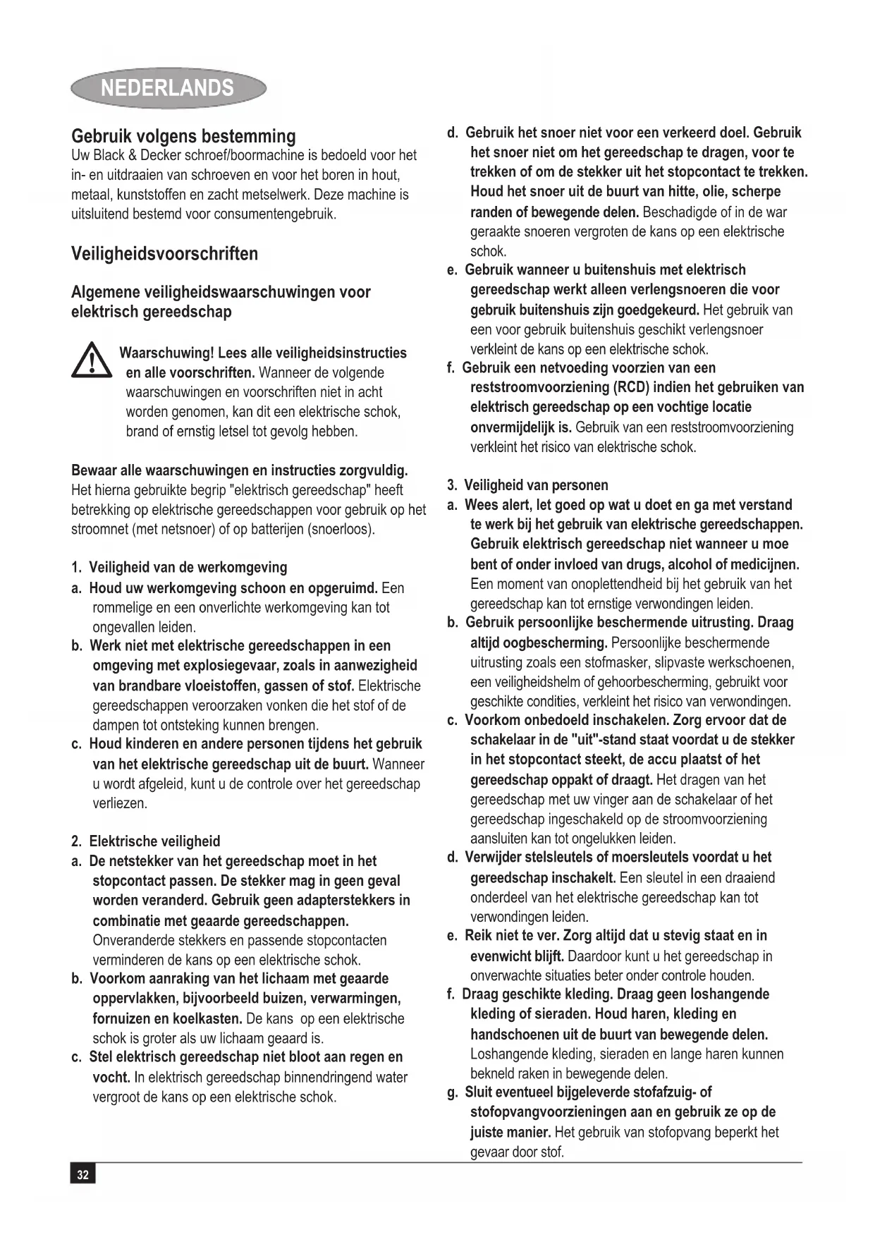 Kevin Hewitt Director of Consumer Engineering Spennymoor, County Durham DL16 6JG, Verenigd Koninkrijk 23-3-2009 Garantie Black & Decker heeft vertrouwen in zijn producten en biedt een uitstekende garantie. Deze garantiebepalingen vormen een aanvulling op uw wettelijke rechten en beperken deze niet. De garantie geldt in de lidstaten van de Europese Unie en de Europese Vrijhandelsassociatie. Mocht uw Black & Decker product binnen 24 maanden na datum van aankoop defect raken tengevolge van materiaal- of constructiefouten, dan garanderen wij de kosteloze vervanging van defecte onderdelen, de reparatie van het product of de vervanging van het product, tenzij: u Het product is gebruikt voor handelsdoeleinden, professionele toepassingen of verhuurdoeleinden; u Het product onoordeelkundig is gebruikt;u Het product is beschadigd door invloeden van buitenaf of door een ongeval; u Reparaties zijn uitgevoerd door anderen dan onze servicecentra of Black & Decker personeel. Om een beroep op de garantie te doen, dient u een aankoopbewijs te overhandigen aan de verkoper of een van onze servicecentra. U kunt het adres van het dichtstbijzijnde servicecentrum opvragen via de adressen op de achterzijde van deze handleiding. U kunt ook een lijst van onze servicecentra en meer informatie m.b.t. onze klantenservice vinden op het volgende Internet-adres: www.2helpU.com Meld u aan op onze website www.blackanddecker.nl om te worden geïnformeerd over nieuwe producten en speciale aanbiedingen. Verdere informatie over het merk Black & Decker en onze producten vindt u op www.blackanddecker.nl39 ESPAÑOL Finalidad El taladro/atornillador Black & Decker ha sido diseñado para atornillar y desatornillar así como para taladrar madera, metal, plástico y mampostería blanda. Esta herramienta está pensada únicamente para uso doméstico. Instrucciones de seguridad Advertencias de seguridad generales para herramientas eléctricas