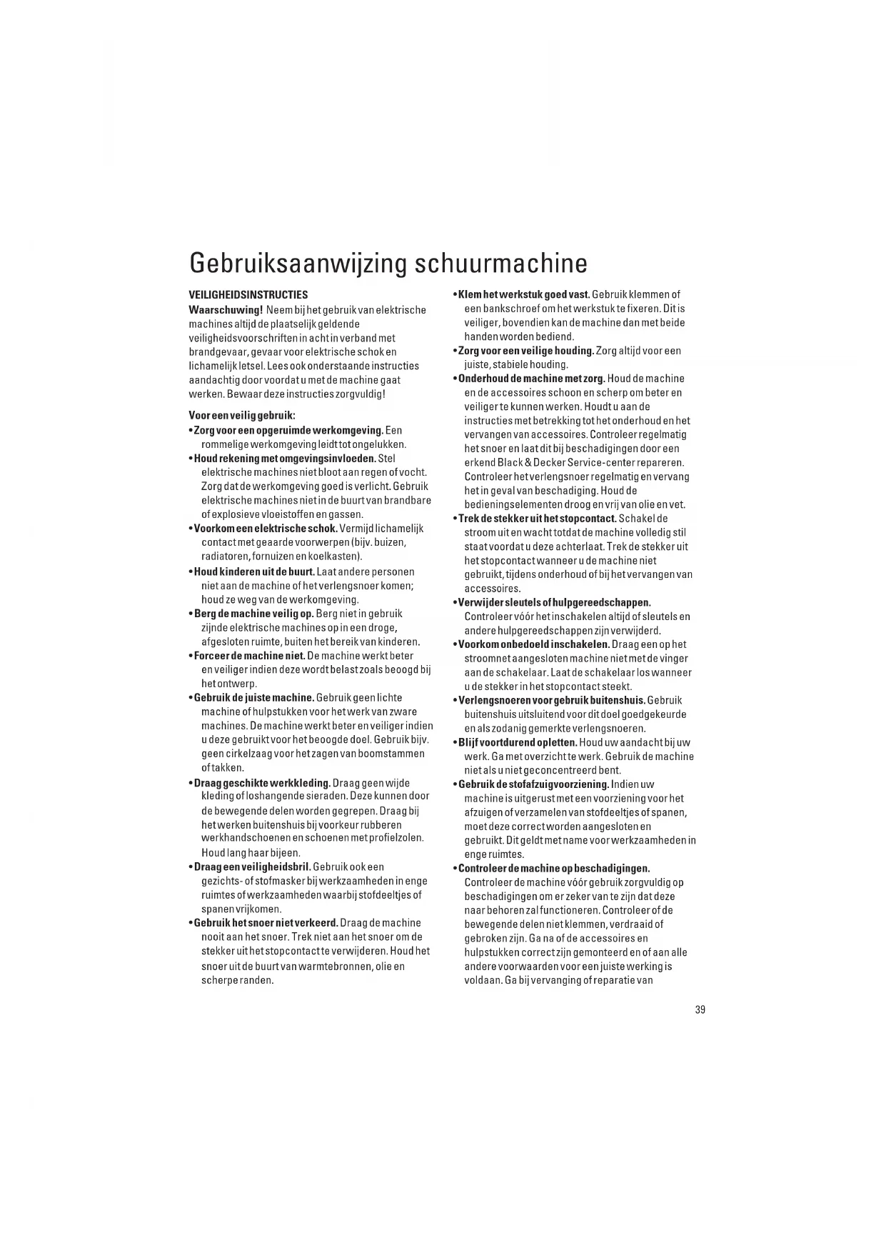 150W, 10500/min Brian Cooke - Director of Engineering Black & Decker Ltd, Spennymoor, County Durham DL16 6JG, United Kingdom La politica della Black & Decker è di migliorare continuamente i propri prodotti, per cui l’azienda si riserva il diritto di cambiare le caratteristiche del prodotto senza previa comunicazione.39 Gebruiksaanwijzing schuurmachine VEILIGHEIDSINSTRUCTIES Waarschuwing! Neem bij het gebruik van elektrische machines altijd de plaatselijk geldende veiligheidsvoorschriften in acht in verband met brandgevaar, gevaar voor elektrische schok en lichamelijk letsel. Lees ook onderstaande instructies aandachtig door voordat u met de machine gaat werken. Bewaar deze instructies zorgvuldig! Voor een veilig gebruik: