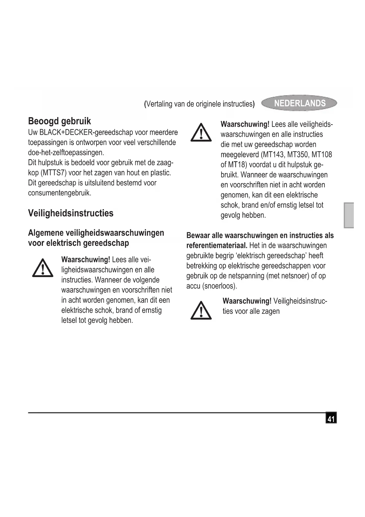 MTTS7 Black & Decker verklaart dat deze producten, die zijn beschreven onder ‘Technische gegevens’, voldoen aan: 2006/42/EG, EN60745-1, EN60745-2-5 Deze producten voldoen tevens aan richtlijn 2014/30/EU en 2011/65/EU. Neem voor meer informatie contact op met Black & Decker op het volgende adres of raadpleeg de achterzijde van de handleiding. Ondergetekende is verantwoordelijk voor de com- pilatie van het technische bestand en doet deze verklaring namens Black & Decker. R. Laverick Engineering Manager Black & Decker Europe, 210 Bath Road, Slough, Berkshire, SL1 3YD Verenigd Koninkrijk 17/09/201451 (Traducción de las instrucciones originales) ESPAÑOL Uso especíco La herramienta multifunción BLACK+DECKER se ha diseñado para una amplia gama de aplicaciones de bricolaje. Mediante la utilización de la hoja (MTTS7), esta herramienta puede serrar madera y plásticos. Esta herramienta está pensada únicamente para uso doméstico. Instrucciones de seguridad Advertencias de seguridad generales para herramientas eléctricas