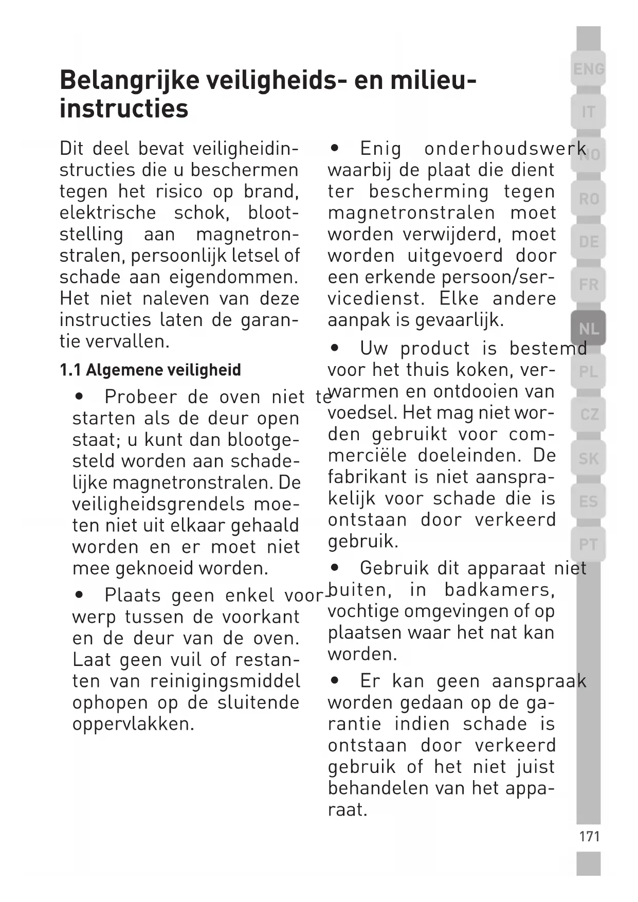 - Er kan geen aanspraak worden gedaan op de ga- rantie indien schade is ontstaan door verkeerd gebruik of het niet juist behandelen van het appa- raat. Belangrijke veiligheids- en milieu- instructies172 Belangrijke veiligheids- en milieu- instructies
