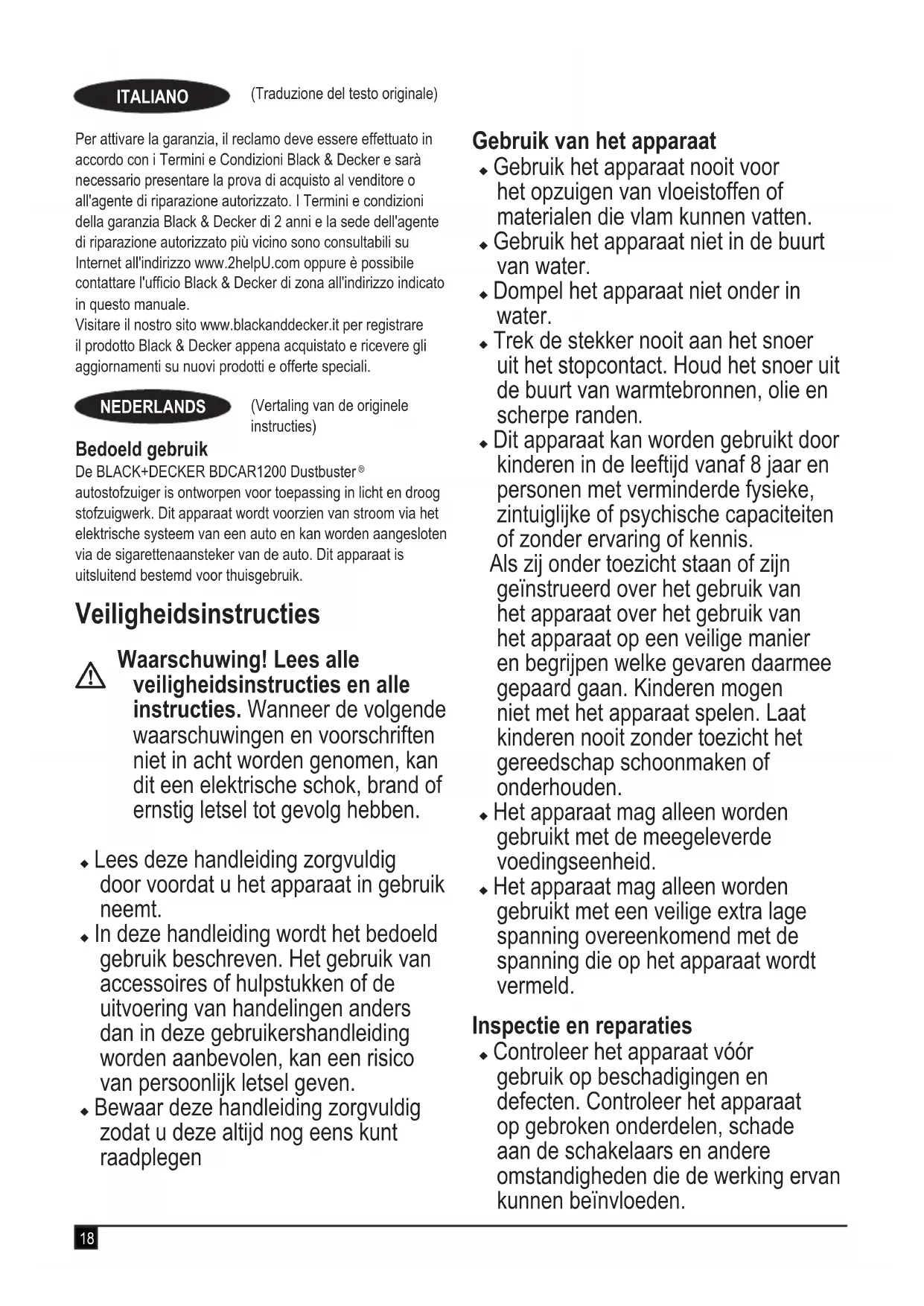 Waarschuwing! Lees alle veiligheidsinstructies en alle instructies. Wanneer de volgende waarschuwingen en voorschriften niet in acht worden genomen, kan dit een elektrische schok, brand of ernstig letsel tot gevolg hebben. u Lees deze handleiding zorgvuldig door voordat u het apparaat in gebruik neemt. u In deze handleiding wordt het bedoeld gebruik beschreven. Het gebruik van accessoires of hulpstukken of de uitvoering van handelingen anders dan in deze gebruikershandleiding worden aanbevolen, kan een risico van persoonlijk letsel geven. u Bewaar deze handleiding zorgvuldig zodat u deze altijd nog eens kunt raadplegen Gebruik van het apparaat u Gebruik het apparaat nooit voor het opzuigen van vloeistoffen of materialen die vlam kunnen vatten. u Gebruik het apparaat niet in de buurt van water. u Dompel het apparaat niet onder in water. u Trek de stekker nooit aan het snoer uit het stopcontact. Houd het snoer uit de buurt van warmtebronnen, olie en scherpe randen. u Dit apparaat kan worden gebruikt door kinderen in de leeftijd vanaf 8 jaar en personen met verminderde fysieke, zintuiglijke of psychische capaciteiten of zonder ervaring of kennis. Als zij onder toezicht staan of zijn geïnstrueerd over het gebruik van het apparaat over het gebruik van het apparaat op een veilige manier en begrijpen welke gevaren daarmee gepaard gaan. Kinderen mogen niet met het apparaat spelen. Laat kinderen nooit zonder toezicht het gereedschap schoonmaken of onderhouden. u Het apparaat mag alleen worden gebruikt met de meegeleverde voedingseenheid. u Het apparaat mag alleen worden gebruikt met een veilige extra lage spanning overeenkomend met de spanning die op het apparaat wordt vermeld. Inspectie en reparaties u Controleer het apparaat vóór gebruik op beschadigingen en defecten. Controleer het apparaat op gebroken onderdelen, schade aan de schakelaars en andere omstandigheden die de werking ervan kunnen beïnvloeden.19 (Vertaling van de originele instructies) NEDERLANDS u Werk niet met het apparaat als een onderdeel beschadigd is of defect. u Laat beschadigde of defecte onderdelen door een van onze servicecentra repareren of vervangen. u Controleer het snoer regelmatig op beschadiging. Vervang het snoer als het beschadigd of defect is. u Probeer nooit andere onderdelen te verwijderen of te vervangen dan in deze handleiding worden vermeld. Aanvullende Veiligheidsinstructies Overige risico's Er kunnen zich bij het gebruik van dit gereedschap nog meer risico's voordoen, die mogelijk niet in de bijgesloten veiligheidswaarschuwingen worden beschreven. Deze risico’s kunnen zich voordoen bij verkeerd of langdurig gebruik, enz. Ook als de geldende veiligheidsvoorschriften worden gevolgd en de juiste veiligheidsvoorzieningen worden getroffen, kunnen bepaalde risico's niet worden uitgesloten. Dit zijn onder meer: u Verwondingen die worden veroorzaakt door het aanraken van bewegende onderdelen. u Verwondingen die worden veroorzaakt door het aanraken van warme onderdelen. u Verwondingen die worden veroorzaakt bij het vervangen van onderdelen of accessoires. u Verwondingen die worden veroorzaakt door langdurig gebruik van het apparaat. Wanneer u het apparaat gedurende langere perioden gebruikt, is het belangrijk dat u de werkzaamheden regelmatig onderbreekt. Elektrische veiligheid Het apparaat is ontworpen voor gebruik met 12V-voertuigaccusystemen met negatieve aarding. Waarschuwing! De aansluiting voor de sigarettenaansteker is uitgerust met een niet-vervangbare veiligheidszekering. De zekering zal mogelijk doorslaan wanneer er zich een storing voordoet. In dat geval moet de zekering samen met de aansluiting en het snoer worden vervangen door de fabrikant of een Black & Decker-servicecentrum om gevaren te voorkomen. Waarschuwing! Gebruik het apparaat niet met systemen die positieve aarding of een ander voltage hebben. Functies Dit apparaat heeft enkele of alle van de volgende functies.