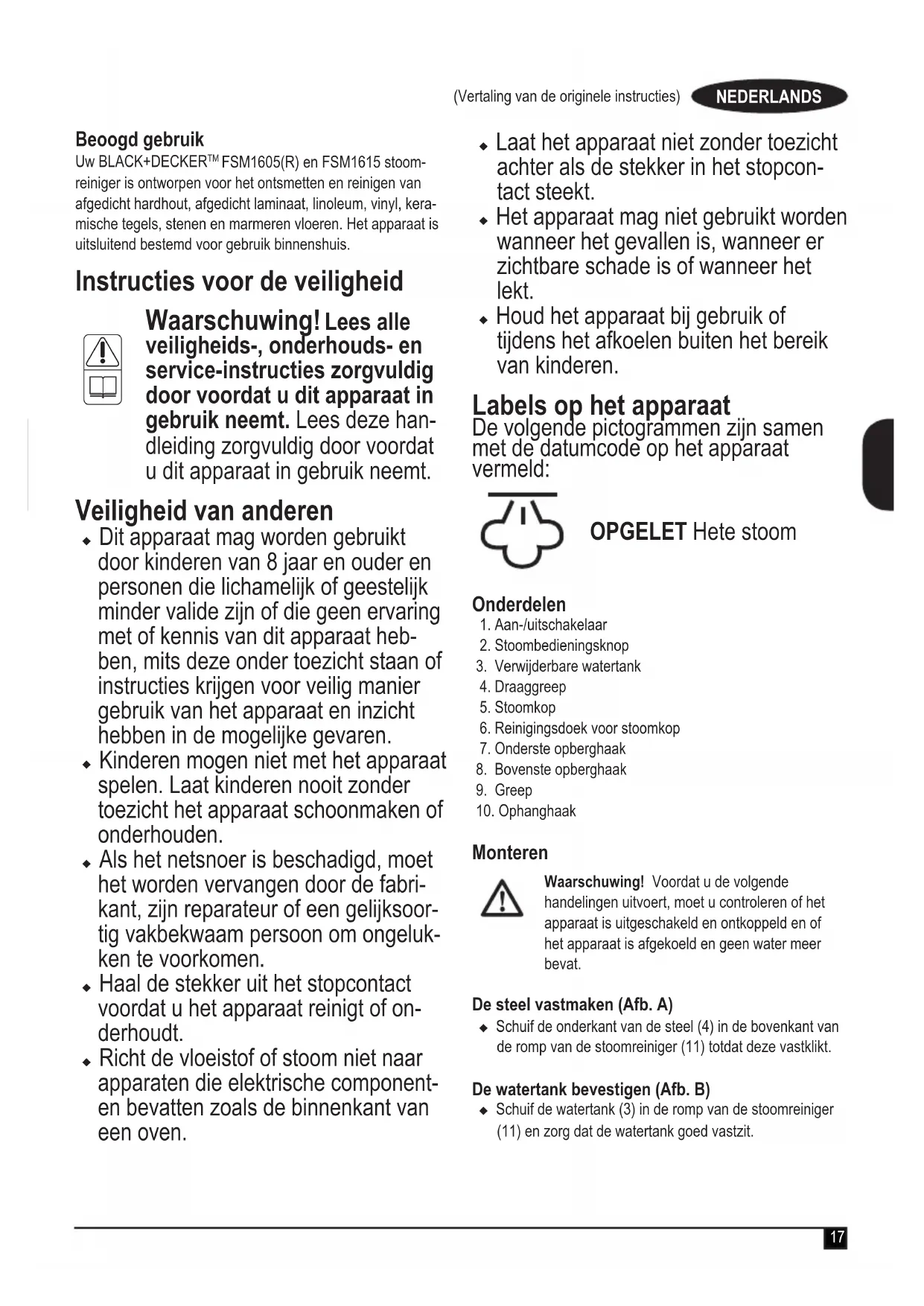 Waarschuwing! Lees alle veiligheids-, onderhouds- en service-instructies zorgvuldig door voordat u dit apparaat in gebruik neemt. Lees deze han- dleiding zorgvuldig door voordat u dit apparaat in gebruik neemt. Veiligheid van anderen u Dit apparaat mag worden gebruikt door kinderen van 8 jaar en ouder en personen die lichamelijk of geestelijk minder valide zijn of die geen ervaring met of kennis van dit apparaat heb- ben, mits deze onder toezicht staan of instructies krijgen voor veilig manier gebruik van het apparaat en inzicht hebben in de mogelijke gevaren. u Kinderen mogen niet met het apparaat spelen. Laat kinderen nooit zonder toezicht het apparaat schoonmaken of onderhouden. u Als het netsnoer is beschadigd, moet het worden vervangen door de fabri- kant, zijn reparateur of een gelijksoor- tig vakbekwaam persoon om ongeluk- ken te voorkomen. u Haal de stekker uit het stopcontact voordat u het apparaat reinigt of on- derhoudt. u Richt de vloeistof of stoom niet naar apparaten die elektrische component- en bevatten zoals de binnenkant van een oven. u Laat het apparaat niet zonder toezicht achter als de stekker in het stopcon- tact steekt. u Het apparaat mag niet gebruikt worden wanneer het gevallen is, wanneer er zichtbare schade is of wanneer het lekt. u Houd het apparaat bij gebruik of tijdens het afkoelen buiten het bereik van kinderen. Labels op het apparaat De volgende pictogrammen zijn samen met de datumcode op het apparaat vermeld: OPGELET Hete stoom Onderdelen 1. Aan-/uitschakelaar 2. Stoombedieningsknop 3. Verwijderbare watertank 4. Draaggreep 5. Stoomkop 6. Reinigingsdoek voor stoomkop 7. Onderste opberghaak 8. Bovenste opberghaak 9. Greep 10. Ophanghaak Monteren Waarschuwing! Voordat u de volgende handelingen uitvoert, moet u controleren of het apparaat is uitgeschakeld en ontkoppeld en of het apparaat is afgekoeld en geen water meer bevat. De steel vastmaken (Afb. A) u Schuif de onderkant van de steel (4) in de bovenkant van de romp van de stoomreiniger (11) totdat deze vastklikt. De watertank bevestigen (Afb. B) u Schuif de watertank (3) in de romp van de stoomreiniger (11) en zorg dat de watertank goed vastzit.18 (Vertaling van de originele instructies) NEDERLANDS Een reinigingsdoek plaatsen (Afb. C) Vervangende reinigingsdoeken zijn verkrijgbaar via uw BLACK+DECKER-leverancier:- (cat.nr. FSMP20-XJ). u Plaats een reinigingsdoek (6) op de vloer met de 'haak&lus'-zijde naar boven gericht. u Druk de stoomkop lichtjes op de reinigingsdoek (6). Let op: Plaats uw stoomreiniger altijd met de steel (4) rechtop wanneer deze stilstaat en zorg ervoor dat de stoomreiniger is uitgeschakeld wanneer u deze niet gebruikt. Een reinigingsdoek afhalen Let op! Draag altijd geschikte schoenen wanneer u de reinigingsdoeken verwisselt op de stoomreiniger. Draag geen slippers of schoeisel met open tenen. u Zet de steel (4) rechtop en schakel de stoomreiniger 'UIT'. u Wacht totdat de stoomreiniger is afgekoeld (circa 5 minuten). u Haal de stoomreiniger weg van de reinigingsdoek om deze van het klittenband los te maken. Let op! Plaats uw stoomreiniger altijd met de steel (4) rechtop wanneer deze stilstaat en zorg ervoor dat de stoomreiniger is uitgeschakeld wanneer u deze niet gebruikt. De watertank vullen (Afb. D) De watertank op uw stoomreiniger is verwijderbaar, zodat u deze handig en eenvoudig kunt vullen. Opmerking! Vul de watertank met schoon kraanwater. Opmerking! In gebieden met hard water wordt het gebruik van gedeïoniseerd water aangeraden. u Verwijder de watertank (3). u Verwijder de lterkap door deze linksom los te schroeven. u Vul de watertank (3) met water. Waarschuwing! Uw watertank heeft een capaciteit van 350 milliliter. Zorg er bij het vullen voor dat de tank niet te vol raakt. u Plaats de lterkap terug door deze rechtsom vast te schroeven. u Plaats de watertank (3) terug. Opmerking! Zorg ervoor dat de lterkap goed vastzit. Opmerking! Gebruik geen chemische schoonmaakmiddelen in de watertank van uw stoomreiniger. Gebruik van het apparaat Belangrijk! Wanneer dit apparaat in naleving van deze han- dleiding wordt gebruikt, de microberdoek is geplaatst en het apparaat ten minste 90 seconden wordt aangezet, doodt het apparaat 99,9% van alle bacteriën en ziektekiemen. In- en uitschakelen u Druk op de Aan/uit-schakelaar (1) om het apparaat in te schakelen. Het duurt ongeveer 15 seconden voordat de stoomreiniger is opgewarmd. u Druk op de stoombedieningsknop (2). De pomp wordt geactiveerd en het apparaat begint stoom te produceren. u Om het genereren van stoom te stoppen, draait u de stoomknop (2) naar OFF (uit). Dit handhaaft het vermogen naar de boiler voor een snellere herstart van het apparaat. u Druk op de Aan/uit-schakelaar (1) om het apparaat uit te schakelen. Let op! Laat de stoomreiniger nooit langere tijd op één punt van het oppervlak staan. Plaats de stoomreiniger altijd met de steel (4) rechtop wanneer deze stilstaat en zorg ervoor dat de stoomreiniger is uitgeschakeld wanneer u deze niet gebruikt. Let op! Leeg de stoomreiniger altijd na gebruik. Opmerking! Wanneer u de stoomreiniger voor de eerste keer vult of nadat de watertank leeg is geweest, kan het tot 45 seconden duren voordat er stoom wordt geproduceerd. Tips voor optimaal gebruik Algemeen Let op: Gebruik de stoomreiniger nooit voordat u een reinig- ingsdoek hebt aangebracht. u Veeg of stofzuig de vloer altijd voordat u de stoomreiniger gebruikt. u De gemakkelijkste manier om het apparaat te gebruiken, is door de steel 45º te kantelen en langzaam schoon te maken, waarbij u telkens kleine stukjes schoonmaakt. u Gebruik geen chemische schoonmaakmiddelen in com- binatie met de stoomreiniger. U kunt vinyl- of linoleum- vloeren voorbehandelen met een mild reinigingsmiddel en wat water voordat u de stoomreiniger gebruikt, om hardnekkige vlekken te verwijderen. Stoomreinigen u Plaats een reinigingsdoek (6) op de vloer met de 'haak&lus'-zijde naar boven gericht. u Druk de stoomkop licht op de reinigingsdoek (6). u Slui