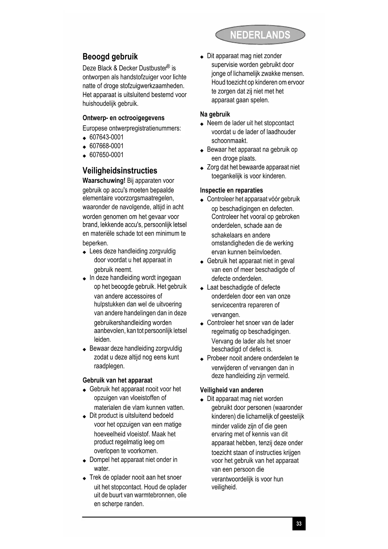 Gebruik de lader van Black & Decker alleen voor de accu in het gereedschap/apparaat waar bij de lader is bijgeleverd. Andere accu's hunnen exploderen met letsel en materièle schade als gevolg.