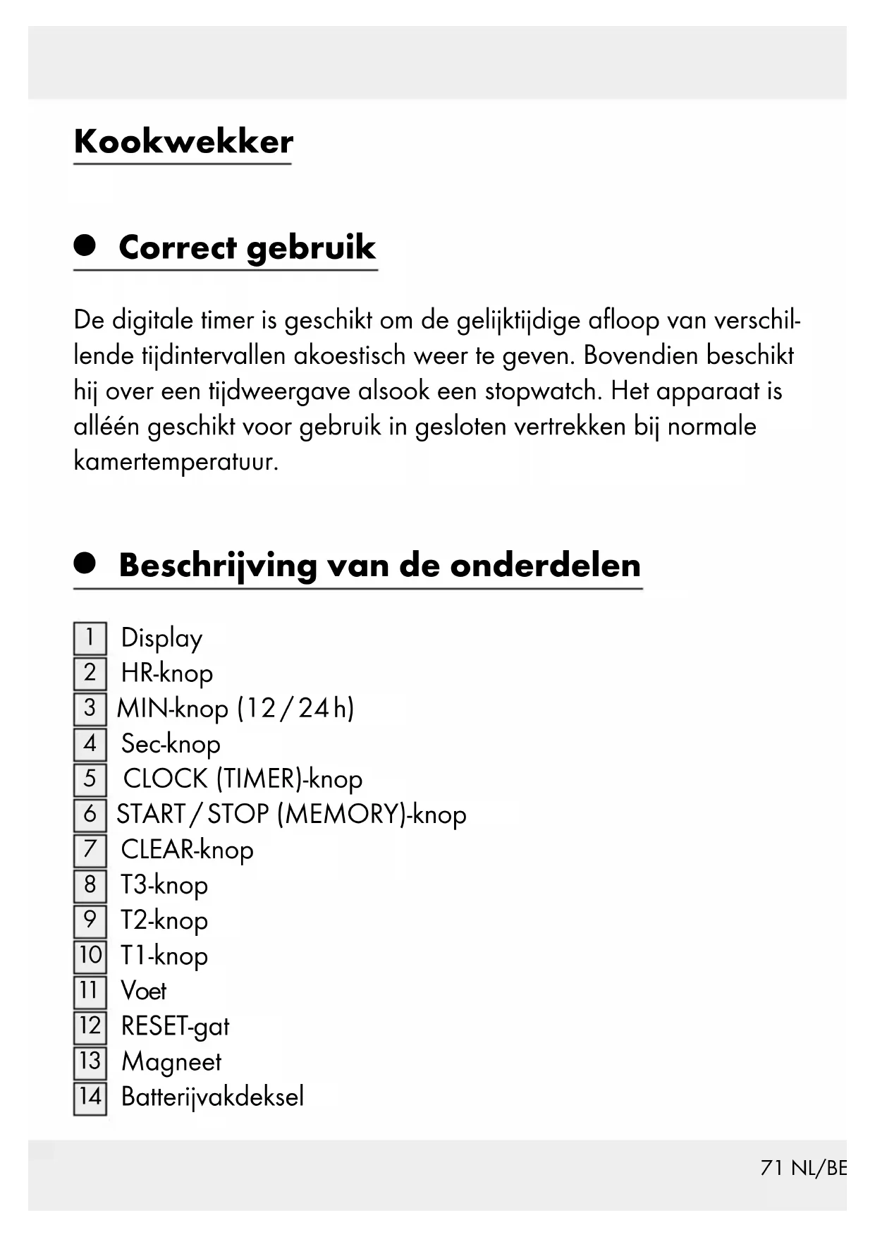 Correct gebruik De digitale timer is geschikt om de gelijktijdige afloop van verschil- lende tijdintervallen akoestisch weer te geven. Bovendien beschikt hij over een tijdweergave alsook een stopwatch. Het apparaat is alléén geschikt voor gebruik in gesloten vertrekken bij normale kamertemperatuur.