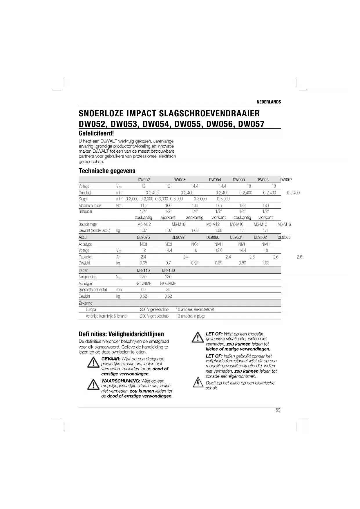 - Neem de tijd om deze gebruiksaanwijzing grondig te lezen en te begrijpen vóór gebruik. Beschrijving (fi g. 1) WAARSCHUWING: Verander nooit het elektrische gereedschap of enig onderdeel daarvan. Dit kan leiden tot schade of lichamelijke verwondingen. BEOOGD GEBRUIK De DW052, DW053, DW054, DW055, DW056 en DW057 snoerloze impact slagschroevendraaiers zijn ontworpen voor gebruik bij professioneel impact schroefwerk. De impactfunctie maakt dit gereedschap bijzonder nuttig om spijkers in hout, metaal en cement te schroeven. NIET gebruiken in vochtige omstandigheden of in de aanwezigheid van ontvlambare vloeistoffen of gassen. De snoerloze impact slagschroevendraaiers zijn professioneel elektrisch gereedschap. HOUD het gereedschap uit de buurt van kinderen. Toezicht is vereist voor kinderen van minder dan 16 jaar oud. a. Variabele snelheidsschakelaar b. Vooruit/achteruit schuifstuk c. Bithouder d. Pistoolhandgreep e. Accu f. Ontkoppelknoppen g. Lader h. Laadindicator (rood) Lader Uw DE9130 lader accepteert DEWALT NiCd accu’s van 7,2 tot 14,4 V. Uw DE9116 lader accepteert