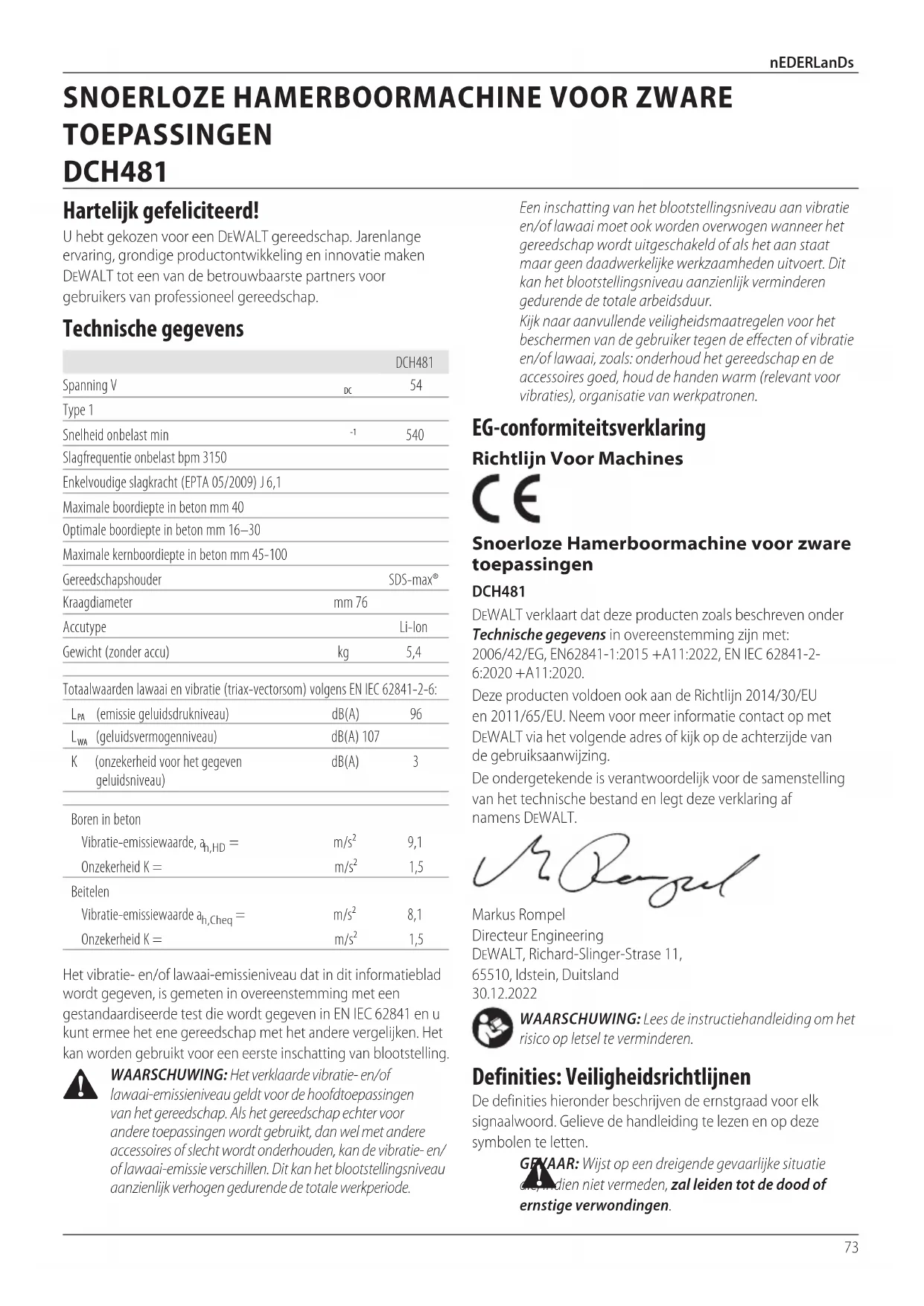 - Le batteria agli ioni di litio sono riciclabili. Consegnarle al proprio concessionario o presso un’apposita stazione di riciclaggio. Le batterie raccolte verranno riciclate o smaltite in modoappropriato.73 nEDERLanDs Een inschatting van het blootstellingsniveau aan vibratie en/of lawaai moet ook worden overwogen wanneer het gereedschap wordt uitgeschakeld of als het aan staat maar geen daadwerkelijke werkzaamheden uitvoert. Dit kan het blootstellingsniveau aanzienlijk verminderen gedurende de totalearbeidsduur. Kijk naar aanvullende veiligheidsmaatregelen voor het beschermen van de gebruiker tegen de effecten of vibratie en/of lawaai, zoals: onderhoud het gereedschap en de accessoires goed, houd de handen warm (relevant voor vibraties), organisatie vanwerkpatronen. EG-conformiteitsverklaring Richtlijn Voor Machines Snoerloze Hamerboormachine voor zware toepassingen DCH481 DeWALT verklaart dat deze producten zoals beschreven onder Technische gegevens in overeenstemming zijn met: 2006/42/EG, EN62841-1:2015 +A11:2022, EN IEC 62841-2- 6:2020 +A11:2020. Deze producten voldoen ook aan de Richtlijn 2014/30/EU en 2011/65/EU. Neem voor meer informatie contact op met DeWALT via het volgende adres of kijk op de achterzijde van degebruiksaanwijzing. De ondergetekende is verantwoordelijk voor de samenstelling van het technische bestand en legt deze verklaring af namensDeWALT. Markus Rompel Directeur Engineering DeWALT, Richard-Slinger-Strase 11, 65510, Idstein, Duitsland