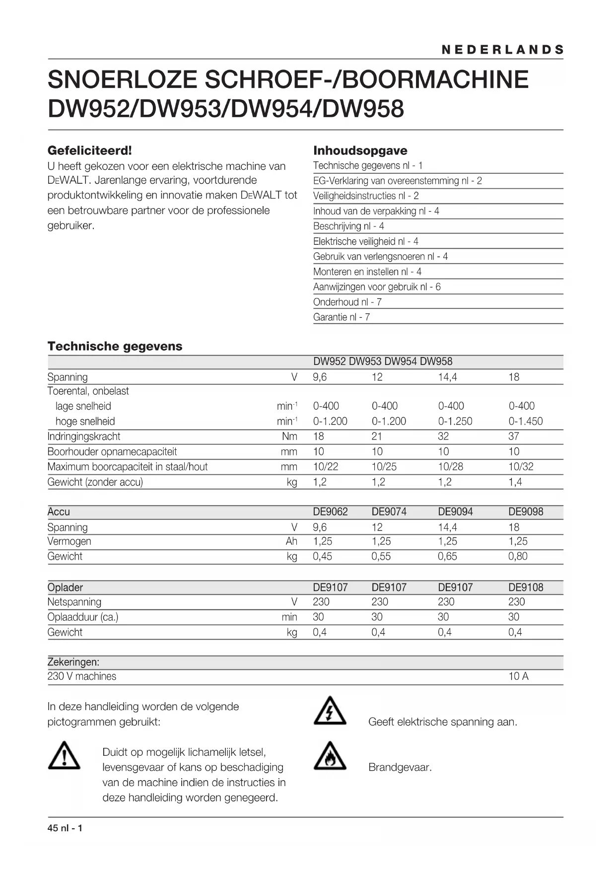 0-1.200 0-1.200 0-1.250 0-1.450 Indringingskracht Nm 18 21 32 37 Boorhouder opnamecapaciteit mm 10 10 10 10 Maximum boorcapaciteit in staal/hout mm 10/22 10/25 10/28 10/32 Gewicht (zonder accu) kg 1,2 1,2 1,2 1,4 Accu DE9062 DE9074 DE9094 DE9098 Spanning V 9,6 12 14,4 18 Vermogen Ah 1,25 1,25 1,25 1,25 Gewicht kg 0,45 0,55 0,65 0,80 Oplader DE9107 DE9107 DE9107 DE9108 Netspanning V 230 230 230 230 Oplaadduur (ca.) min 30 30 30 30 Gewicht kg 0,4 0,4 0,4 0,4 Zekeringen: 230 V machines 10 A In deze handleiding worden de volgende pictogrammen gebruikt: Duidt op mogelijk lichamelijk letsel, levensgevaar of kans op beschadiging van de machine indien de instructies in deze handleiding worden genegeerd. Geeft elektrische spanning aan. Brandgevaar.nl - 2 46 NEDERLANDS EG-Verklaring van overeenstemming DW952/DW953/DW954/DW958 DEWALT verklaart dat deze elektrische machines in overeenstemming zijn met: 89/392/EEG, 89/336/EEG, 73/23/EEG, EN 50144, EN 55104 / EN 55014-2, EN 55014, EN 61000-3-2 & EN 61000-3-3. Neem voor meer informatie contact op met DEWALT, zie het adres hieronder of op de achterkant van deze handleiding. Niveau van de geluidsdruk overeenkomstig 86/188/EEG & 89/392/EEG, gemeten volgens EN 50144: DW952 DW953 DW954 DW958