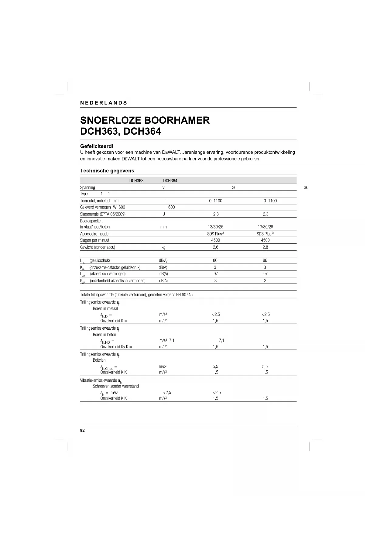 SNOERLOZE BOORHAMER DCH363, DCH364 DEWALT verklaart dat deze producten zoals beschreven onder Technische gegevens in overeenstemming zijn met: 2006/42/EC, EN 60745-1, EN 60745-2-6. Deze producten voldoen ook aan Richtlijn 2004/108/EG en 2011/65/EU. Neem voor meer informatie contact op met DEWALT via het volgende adres of kijk op de achterzijde van de gebruiksaanwijzing. De ondergetekende is verantwoordelijk voor de samenstelling van het technische bestand en legt deze verklaring af namens DEWALT. Horst Grossmann Vice President Engineering DEWALT, Richard-Klinger-Straße 11, D-65510, Idstein, Duitsland