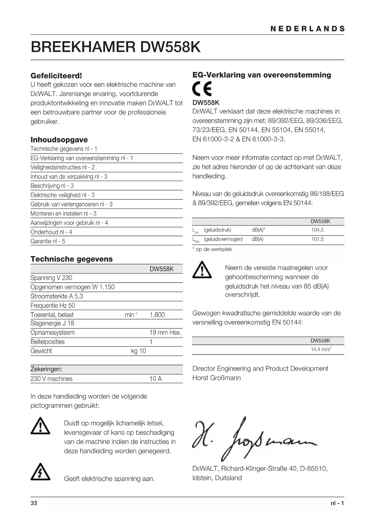 Director Engineering and Product Development Horst Großmann DEWALT, Richard-Klinger-Straße 40, D-65510, Idstein, Duitsland34 NEDERLANDS nl - 2 Veiligheidsinstructies Neem bij het gebruik van elektrische machines altijd de plaatselijk geldende veiligheidsvoorschriften in acht in verband met brandgevaar, gevaar voor elektrische schokken en lichamelijk letsel. Lees ook onderstaande instructies aandachtig door voordat u met de machine gaat werken. Bewaar deze instructies zorgvuldig! Algemeen 1 Zorg voor een opgeruimde werkomgeving Een rommelige werkomgeving leidt tot ongelukken. 2 Houd rekening met omgevingsinvloeden Stel elektrische machines niet bloot aan vocht. Zorg dat de werkomgeving goed is verlicht. Gebruik elektrische machines niet in de buurt van brandbare vloeistoffen of gassen. 3 Voorkom een elektrische schok Vermijd lichamelijk contact met geaarde voorwerpen (bijv. buizen, radiatoren, fornuizen en koelkasten). Onder extreme werkomstandigheden (bijv. hoge vochtigheid, ontwikkeling van metaalstof, enz.) kan de elektrische veiligheid door een scheidingstransformator of een aardlek-(FI-) schakelaar voor te schakelen, verhoogd worden. 4 Houd kinderen uit de buurt Laat andere personen niet aan de machine of het verlengsnoer komen. Onder 16 jaar is supervisie verplicht. 5 Verlengsnoeren voor gebruik buitenshuis Gebruik buitenshuis uitsluitend voor dit doel goedgekeurde en als zodanig gemerkte verlengsnoeren. 6 Berg de machine veilig op Berg niet in gebruik zijnde elektrische machines op in een droge, afgesloten ruimte, buiten het bereik van kinderen. 7 Draag geschikte werkkleding Draag geen wijde kleding of loshangende sieraden. Deze kunnen door de bewegende delen worden gegrepen. Draag bij het werken buitenshuis bij voorkeur rubberen werkhandschoenen en schoenen met profielzolen. Houd lang haar bijeen. 8 Draag een veiligheidsbril Gebruik ook een gezichts- of stofmasker bij werkzaamheden waarbij stofdeeltjes of spanen vrijkomen. 9 Let op de maximum geluidsdruk Neem voorzorgsmaatregelen voor gehoorbescherming wanneer de geluidsdruk het niveau van 85 dB(A) overschrijdt. 10 Klem het werkstuk goed vast Gebruik klemmen of een bankschroef om het werkstuk te fixeren. Dit is veiliger, bovendien kan de machine dan met beide handen worden bediend. 11 Zorg voor een veilige houding Zorg altijd voor een juiste, stabiele houding. 12 Voorkom onbedoeld inschakelen Draag een op het net aangesloten machine niet met de vinger aan de schakelaar. Laat de schakelaar los wanneer u de stekker in het stopcontact steekt. 13 Blijf voortdurend opletten Houd uw aandacht bij uw werk. Ga met verstand te werk. Gebruik de machine niet als u niet geconcentreerd bent. 14 Trek de stekker uit het stopcontact Schakel de stroom uit en wacht totdat de machine volledig stil staat voordat u deze achterlaat. Trek de stekker uit het stopcontact wanneer u de machine niet gebruikt, tijdens onderhoud of bij het vervangen van accessoires. 15 Verwijder sleutels of hulpgereedschappen Controleer vóór het inschakelen altijd of sleutels en andere hulpgereedschappen zijn verwijderd. 16 Gebruik de juiste machine Het gebruik volgens bestemming is beschreven in deze handleiding. Gebruik geen lichte machine of hulpstukken voor het werk van zware machines. De machine werkt beter en veiliger indien u deze gebruikt voor het beoogde doel. Waarschuwing! Gebruik ter voorkoming van lichamelijk letsel uitsluitend de in deze gebruiksaanwijzing aanbevolen accessoires en hulpstukken. Gebruik de machine uitsluitend voor het beoogde doel. 17 Gebruik het snoer niet verkeerd Draag de machine nooit aan het snoer. Trek niet aan het snoer om de stekker uit het stopcontact te verwijderen. Houd het snoer uit de buurt van warmtebronnen, olie en scherpe randen. 18 Onderhoud de machine met zorg Houd de machine schoon om beter en veiliger te kunnen werken. Houdt u aan de instructies met betrekking tot het onderhoud en het vervangen van accessoires. Controleer regelmatig het snoer35 nl - 3 NEDERLANDS en laat dit bij beschadigingen door een erkend DEWALT Service-center repareren. Controleer het verlengsnoer regelmatig en vervang het in geval van beschadiging. Houd de bedieningsorganen droog en vrij van olie en vet. 19 Controleer de machine op beschadigingen Controleer de machine vóór gebruik zorgvuldig op beschadigingen om er zeker van te zijn dat deze naar behoren zal functioneren. Controleer of de bewegende delen niet klemmen, verdraaid of gebroken zijn. Ga na of de accessoires en hulpstukken correct zijn gemonteerd en of aan alle andere voorwaarden voor een juiste werking is voldaan. Ga bij vervanging of reparatie van beschadigde veiligheidsinrichtingen of defecte onderdelen te werk zoals aangegeven. Gebruik geen machine waarvan de schakelaar defect is. Laat de schakelaar vervangen door een erkend DEWALT Service-center. 20 Wendt u voor reparaties tot een erkend DEWALT Service-center Deze elektrische machine voldoet aan alle geldende veiligheidsvoorschriften. Ter voorkoming van ongevallen mogen reparaties uitsluitend door daartoe bevoegde technici worden uitgevoerd. Inhoud van de verpakking De verpakking bevat: 1 Breekhamer 1 Zijhandgreep 1 Inbussleutel 1 Puntbeitel 1 Stofkap 1 Metalen draagkoffer (alleen voor K-modellen) 1 Handleiding 1 Onderdelentekening