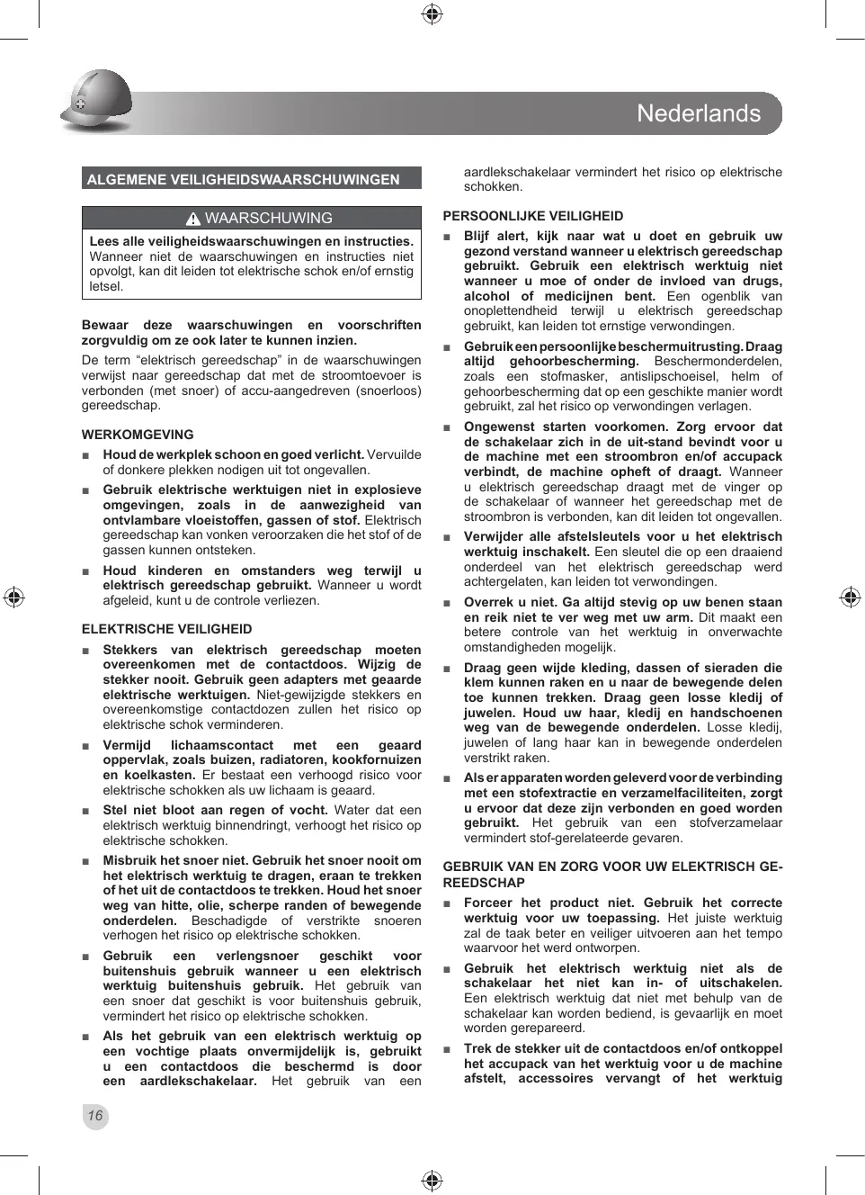 ALGEMENE VEILIGHEIDSWAARSCHUWINGEN WAARSCHUWING Lees alle veiligheidswaarschuwingen en instructies. Wanneer niet de waarschuwingen en instructies niet opvolgt, kan dit leiden tot elektrische schok en/of ernstig letsel. Bewaar deze waarschuwingen en voorschriften zorgvuldig om ze ook later te kunnen inzien. De term “elektrisch gereedschap” in de waarschuwingen verwijst naar gereedschap dat met de stroomtoevoer is verbonden (met snoer) of accu-aangedreven (snoerloos) gereedschap. WERKOMGEVING Ŷ