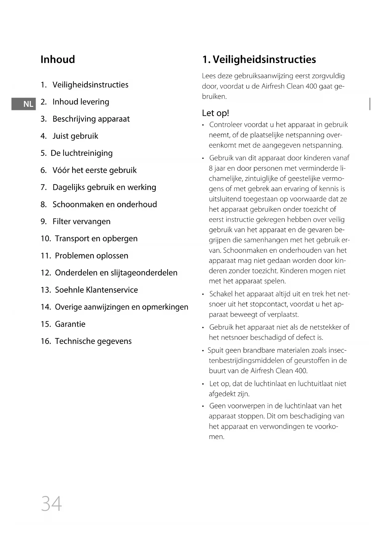 Lees deze gebruiksaanwijzing eerst zorgvuldig door, voordat u de Airfresh Clean 400 gaat ge- bruiken. Let op!