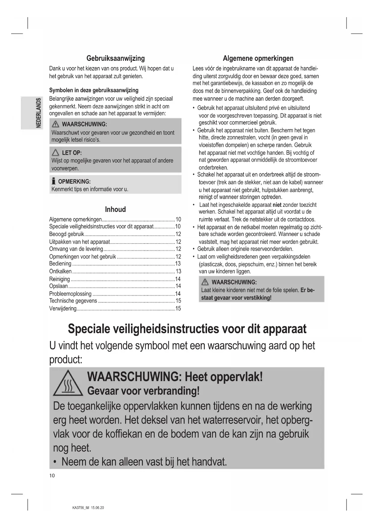 - Speciale veiligheidsinstructies voor dit apparaat p. 10