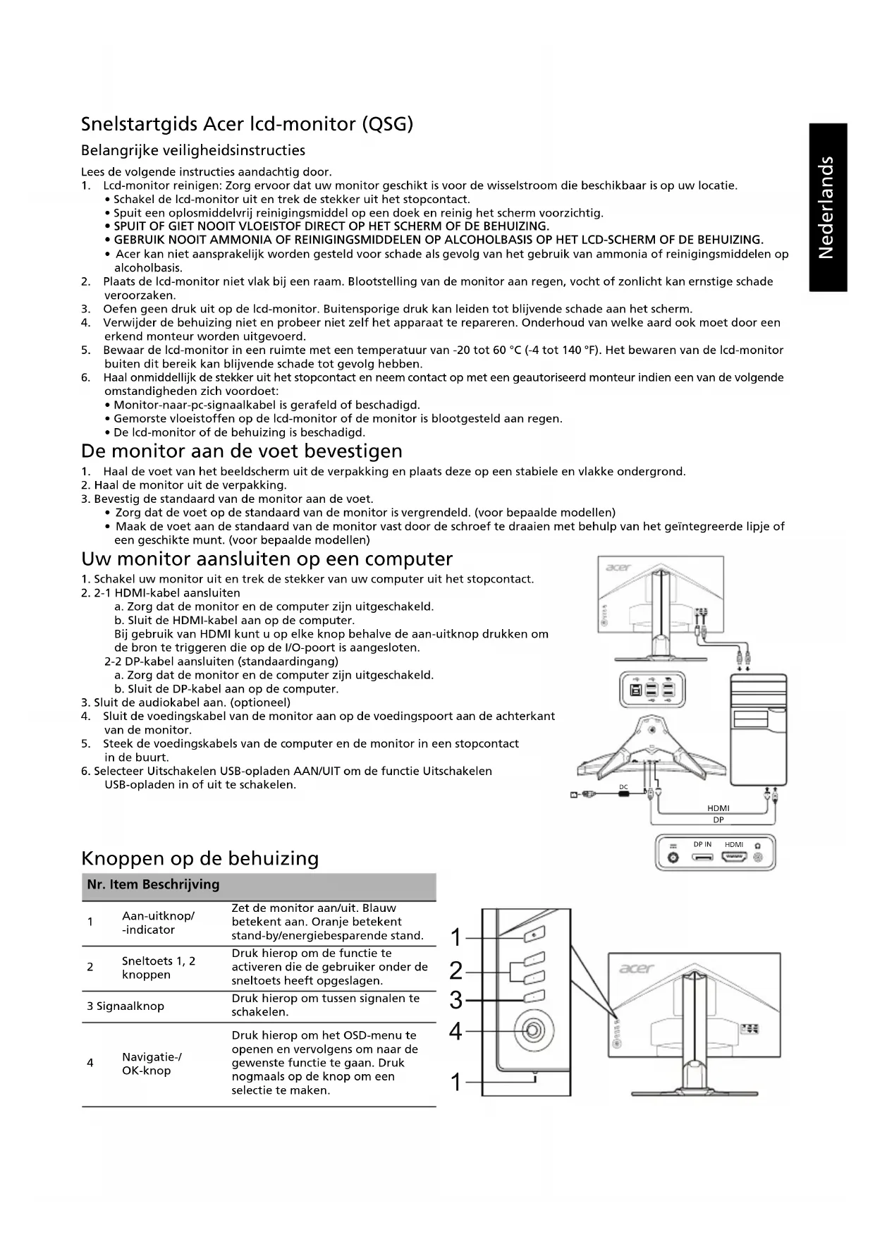 nVidia 3D Light Boost Trasparenza Schermo intero Input Assegnazione tasti Mod Avvio rapido Modalità Over Clock (solo nei modelli con ingresso DP) Informazioni sul display Reset Uscita Tutte le specifiche sono soggette a modifica senza preavviso.Nederlands Snelstartgids Acer lcd-monitor (QSG) Belangrijke veiligheidsinstructies Lees de volgende instructies aandachtig door.