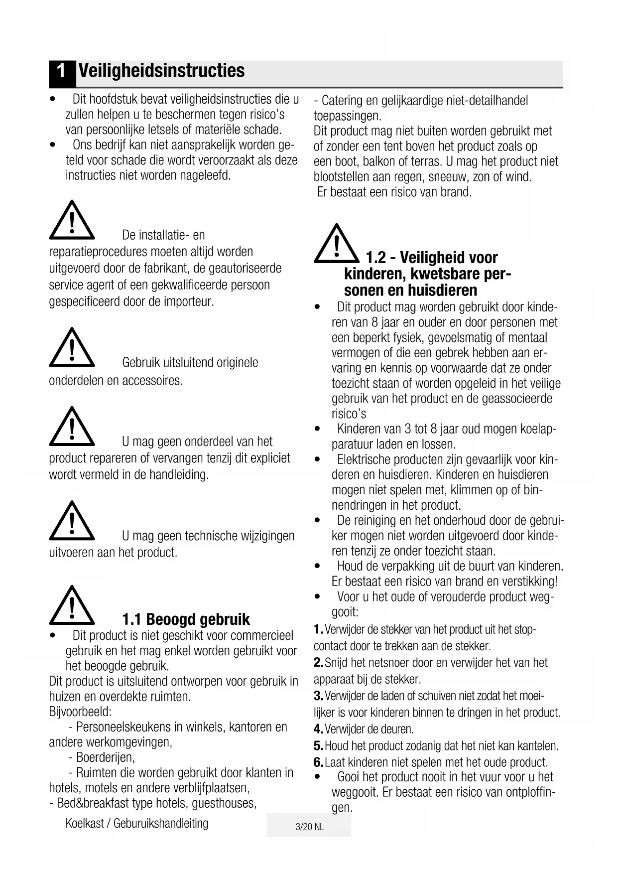 - 6.2. Plastic oppervlakten beschermen 7 Probleemoplossen 193/20 NL Koelkast / Geburuikshandleiting t Dit hoofdstuk bevat veiligheidsinstructies die u zullen helpen u te beschermen tegen risico’s van persoonlijke letsels of materiële schade. t Ons bedrijf kan niet aansprakelijk worden ge- teld voor schade die wordt veroorzaakt als deze instructies niet worden nageleefd. A De installatie- en reparatieprocedures moeten altijd worden uitgevoerd door de fabrikant, de geautoriseerde service agent of een gekwalificeerde persoon gespecificeerd door de importeur. A Gebruik uitsluitend originele onderdelen en accessoires. A U mag geen onderdeel van het product repareren of vervangen tenzij dit expliciet wordt vermeld in de handleiding. A U mag geen technische wijzigingen uitvoeren aan het product. A 1.1 Beoogd gebruik t Dit product is niet geschikt voor commercieel gebruik en het mag enkel worden gebruikt voor het beoogde gebruik. Dit product is uitsluitend ontworpen voor gebruik in huizen en overdekte ruimten. Bijvoorbeeld: - Personeelskeukens in winkels, kantoren en andere werkomgevingen, - Boerderijen, - Ruimten die worden gebruikt door klanten in hotels, motels en andere verblijfplaatsen, - Bed&breakfast type hotels, guesthouses, - Catering en gelijkaardige niet-detailhandel toepassingen. Dit product mag niet buiten worden gebruikt met of zonder een tent boven het product zoals op een boot, balkon of terras. U mag het product niet blootstellen aan regen, sneeuw, zon of wind. Er bestaat een risico van brand. A 1.2 - Veiligheid voor kinderen, kwetsbare per- sonen en huisdieren t Dit product mag worden gebruikt door kinde- ren van 8 jaar en ouder en door personen met een beperkt fysiek, gevoelsmatig of mentaal vermogen of die een gebrek hebben aan er- varing en kennis op voorwaarde dat ze onder toezicht staan of worden opgeleid in het veilige gebruik van het product en de geassocieerde risico’s t Kinderen van 3 tot 8 jaar oud mogen koelap- paratuur laden en lossen. t Elektrische producten zijn gevaarlijk voor kin- deren en huisdieren. Kinderen en huisdieren mogen niet spelen met, klimmen op of bin- nendringen in het product. t De reiniging en het onderhoud door de gebrui- ker mogen niet worden uitgevoerd door kinde- ren tenzij ze onder toezicht staan. t Houd de verpakking uit de buurt van kinderen. Er bestaat een risico van brand en verstikking! t Voor u het oude of verouderde product weg- gooit: p. 18