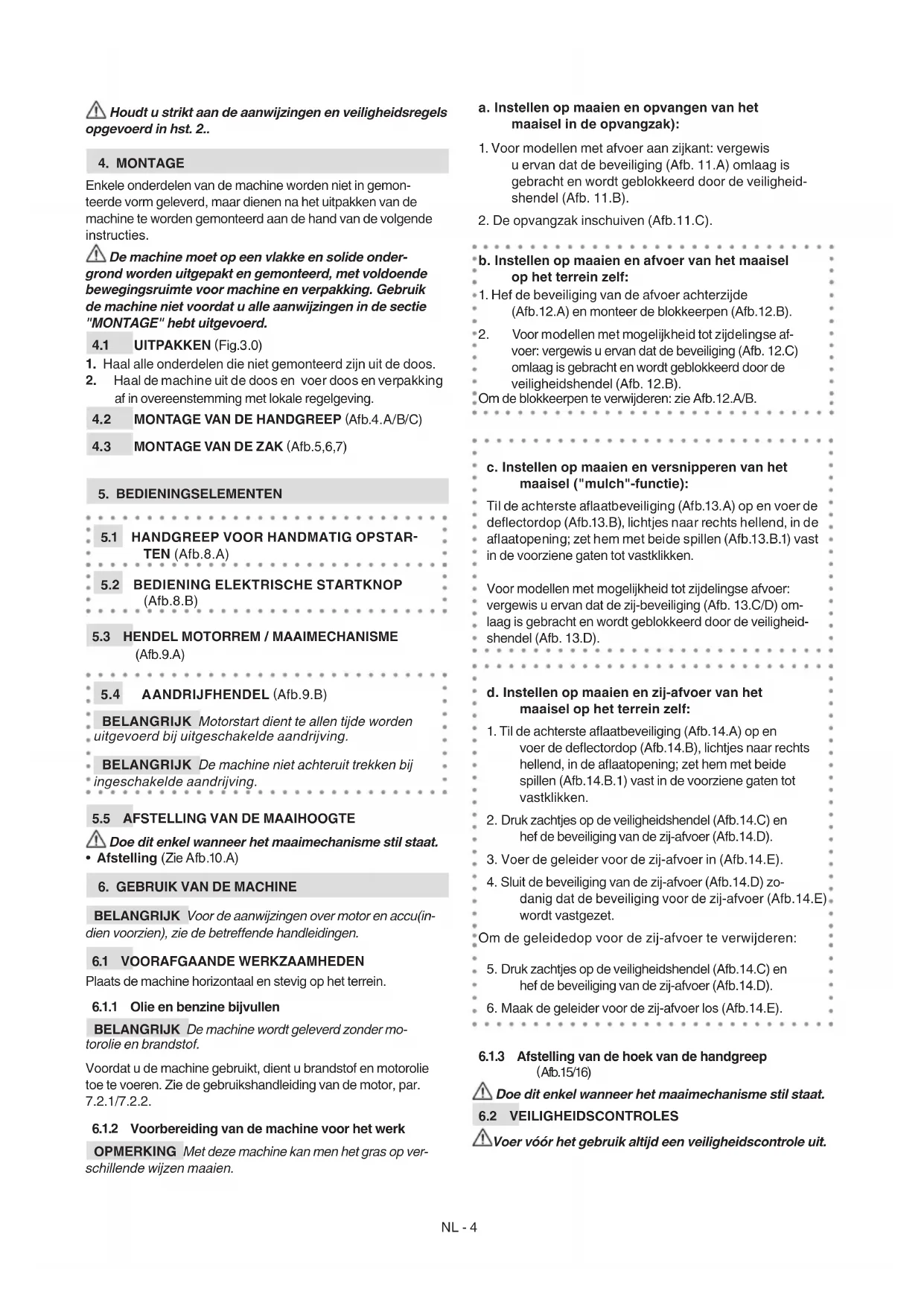 - Gebruik de machine nooit wanneer de beveiligingen bescha- digd zijn, ontbreken of niet correct geplaatst zijn (opvangzak- ken, afvoerbeveiliging aan de zij- en achterkant).