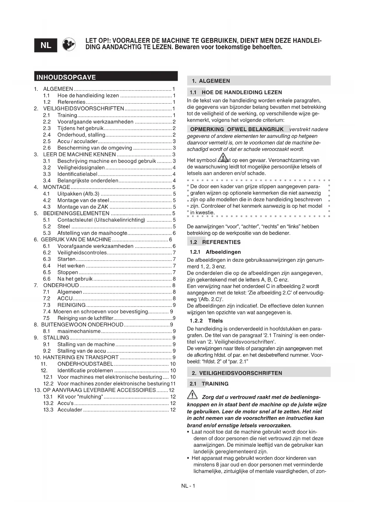 BELANGRIJK De hierna volgende veiligheidsnormen vervolledigen de veiligheidsvoorschriften die aangegeven zijn in de specieke handleiding van de accu en van de ac- culader die samen met de machine afgeleverd worden.