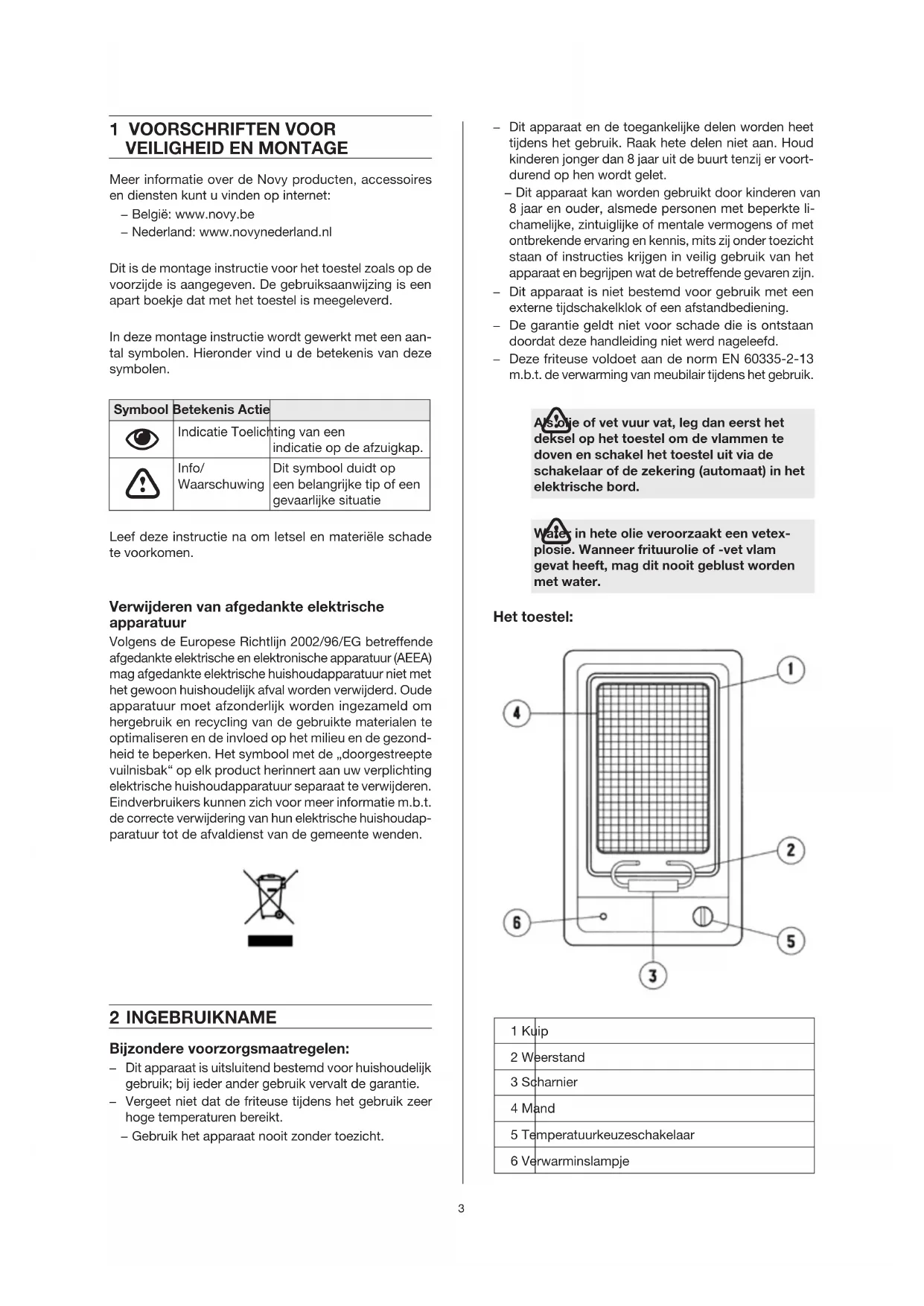 Meer informatie over de Novy producten, accessoires en diensten kunt u vinden op internet: − België: www.novy.be − Nederland: www.novynederland.nl Dit is de montage instructie voor het toestel zoals op de voorzijde is aangegeven. De gebruiksaanwijzing is een apart boekje dat met het toestel is meegeleverd. In deze montage instructie wordt gewerkt met een aan- tal symbolen. Hieronder vind u de betekenis van deze symbolen. Symbool Betekenis Actie