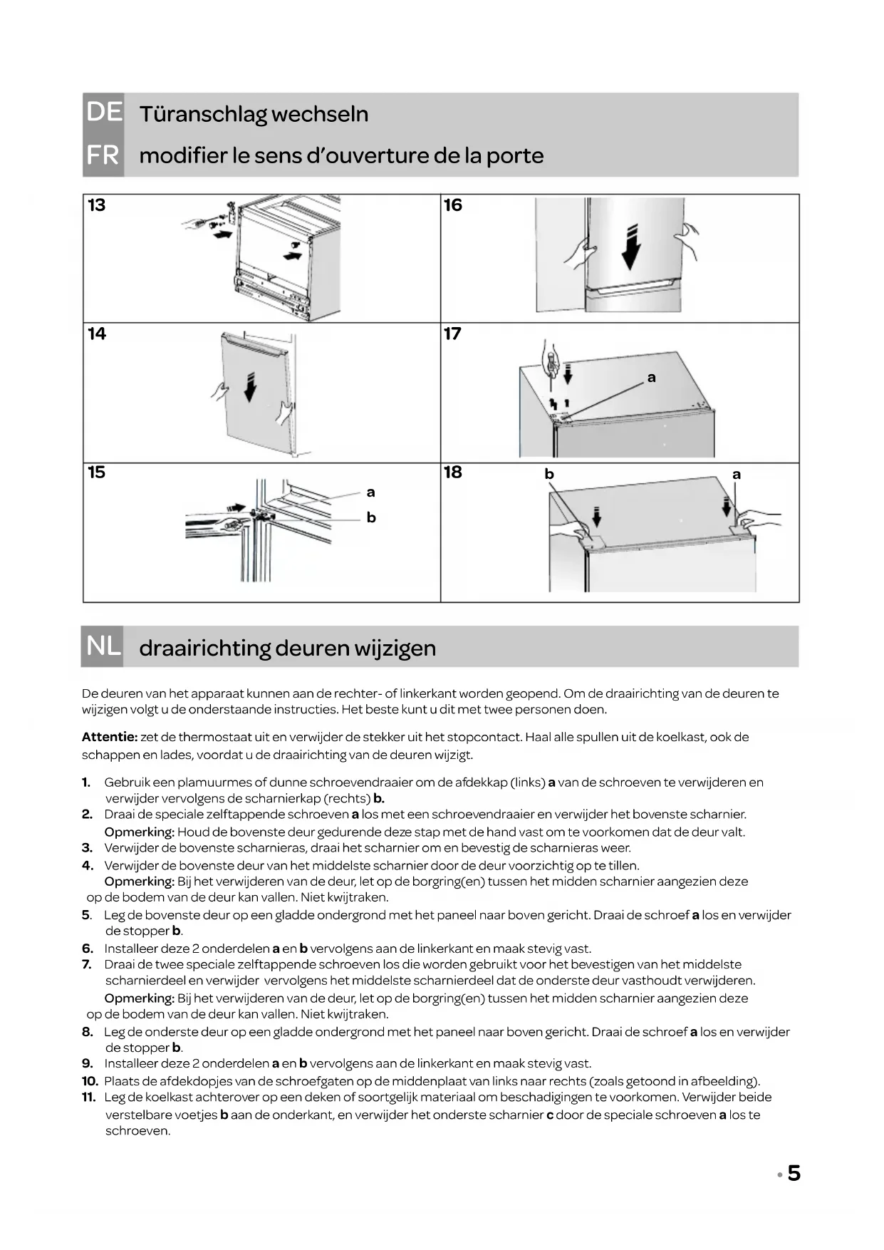 De deuren van het apparaat kunnen aan de rechter- of linkerkant worden geopend. Om de draairichting van de deuren te wijzigen volgt u de onderstaande instructies. Het beste kunt u dit met twee personen doen. Attentie: zet de thermostaat uit en verwijder de stekker uit het stopcontact. Haal alle spullen uit de koelkast, ook de schappen en lades, voordat u de draairichting van de deuren wijzigt.