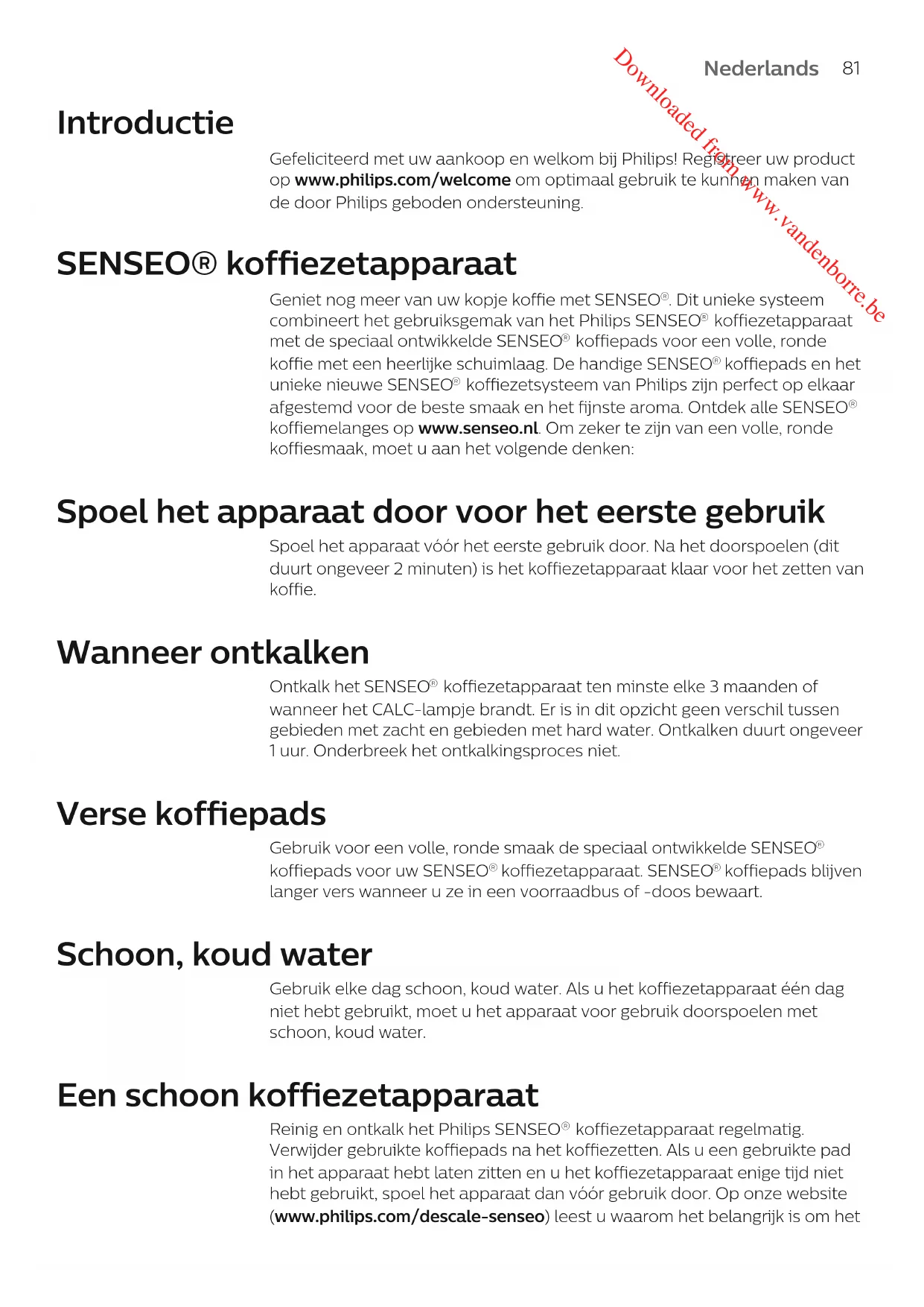 Nederlands Downloaded from www.vandenborre.be- Het apparaat is uitsluitend bedoeld voor normaal huishoudelijk gebruik. Het apparaat is niet bedoeld voor gebruik in personeelskeukens van bijvoorbeeld winkels, kantoren, boerderijen of vergelijkbare werkomgevingen en ook niet voor gebruik door gasten van hotels, motels, bed and breakfasts en andere verblijfsaccommodaties. Elektromagnetische velden (EMV) Dit Philips-apparaat voldoet aan alle toepasbare richtlijnen en voorschriftenmet betrekking tot blootstelling aan elektromagnetische velden. Eerste gebruik Het apparaat doorspoelen vóór het eerste gebruik Het is belangrijk dat u het apparaat en de melktuit voor het eerste gebruikdoorspoelt. Na het doorspoelen (dit duurt ongeveer 2 minuten) is hetkoffiezetapparaat klaar voor het zetten van SENSEO koffie.Let op: Onderbreek nooit halverwege de doorspoelcyclus. Als u dit weldoet, wordt het apparaat niet goed gevuld.