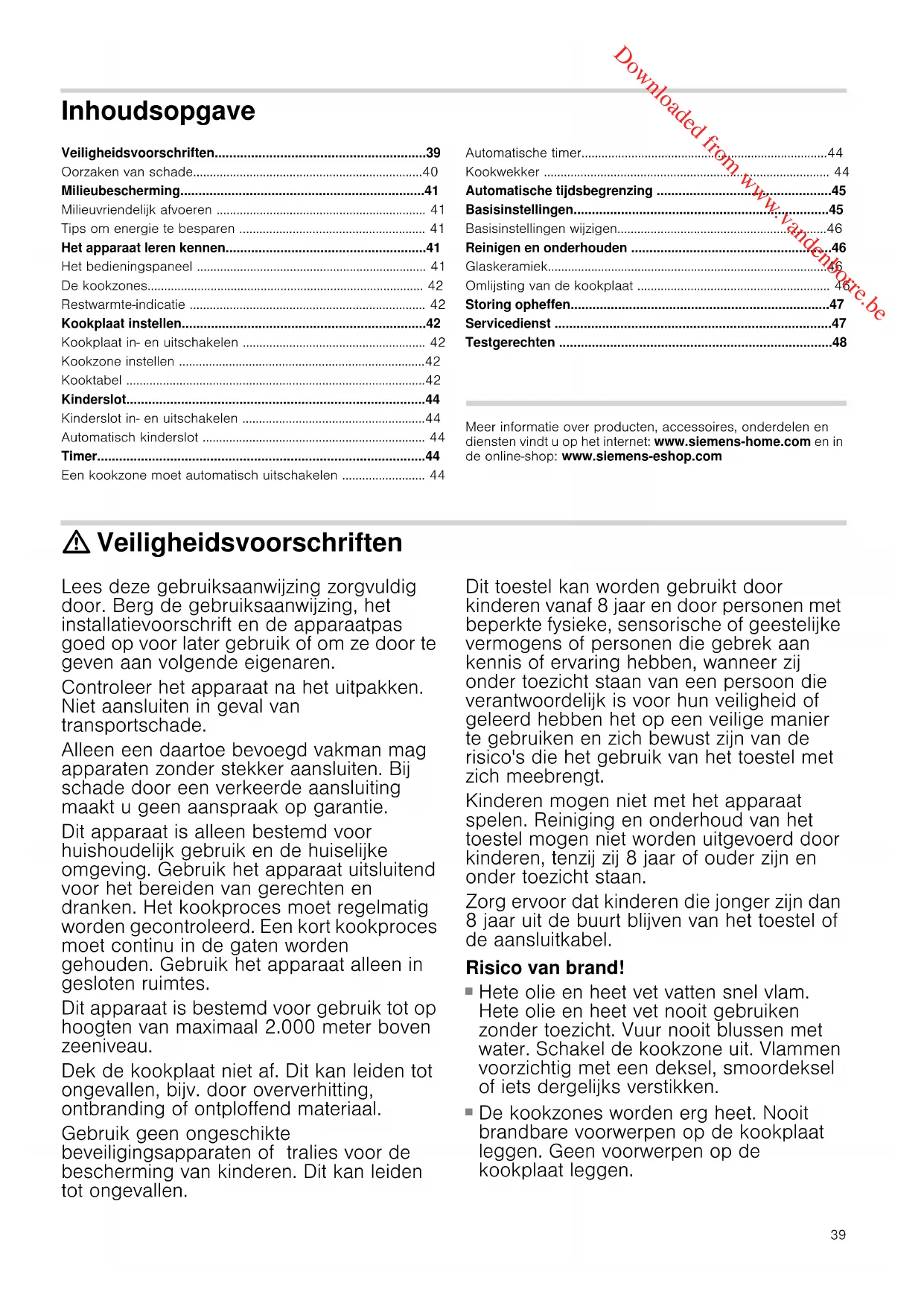 - Testgerechten Produktinfo Meer informatie over producten, accessoires, onderdelen en diensten vindt u op het internet: www.siemens-home.com en in de online-shop: www.siemens-eshop.com : Veiligheidsvoorschriften Lees deze gebruiksaanwijzing zorgvuldig door. Berg de gebruiksaanwijzing, het installatievoorschrift en de apparaatpas goed op voor later gebruik of om ze door te geven aan volgende eigenaren. Controleer het apparaat na het uitpakken. Niet aansluiten in geval van transportschade. Alleen een daartoe bevoegd vakman mag apparaten zonder stekker aansluiten. Bij schade door een verkeerde aansluiting maakt u geen aanspraak op garantie. Dit apparaat is alleen bestemd voor huishoudelijk gebruik en de huiselijke omgeving. Gebruik het apparaat uitsluitend voor het bereiden van gerechten en dranken. Het kookproces moet regelmatig worden gecontroleerd. Een kort kookproces moet continu in de gaten worden gehouden. Gebruik het apparaat alleen in gesloten ruimtes. Dit apparaat is bestemd voor gebruik tot op hoogten van maximaal 2.000 meter boven zeeniveau. Dek de kookplaat niet af. Dit kan leiden tot ongevallen, bijv. door oververhitting, ontbranding of ontploffend materiaal. Gebruik geen ongeschikte beveiligingsapparaten of tralies voor de bescherming van kinderen. Dit kan leiden tot ongevallen. Dit toestel kan worden gebruikt door kinderen vanaf 8 jaar en door personen met beperkte fysieke, sensorische of geestelijke vermogens of personen die gebrek aan kennis of ervaring hebben, wanneer zij onder toezicht staan van een persoon die verantwoordelijk is voor hun veiligheid of geleerd hebben het op een veilige manier te gebruiken en zich bewust zijn van de risico's die het gebruik van het toestel met zich meebrengt. Kinderen mogen niet met het apparaat spelen. Reiniging en onderhoud van het toestel mogen niet worden uitgevoerd door kinderen, tenzij zij 8 jaar of ouder zijn en onder toezicht staan. Zorg ervoor dat kinderen die jonger zijn dan 8 jaar uit de buurt blijven van het toestel of de aansluitkabel. Risico van brand! p. 48