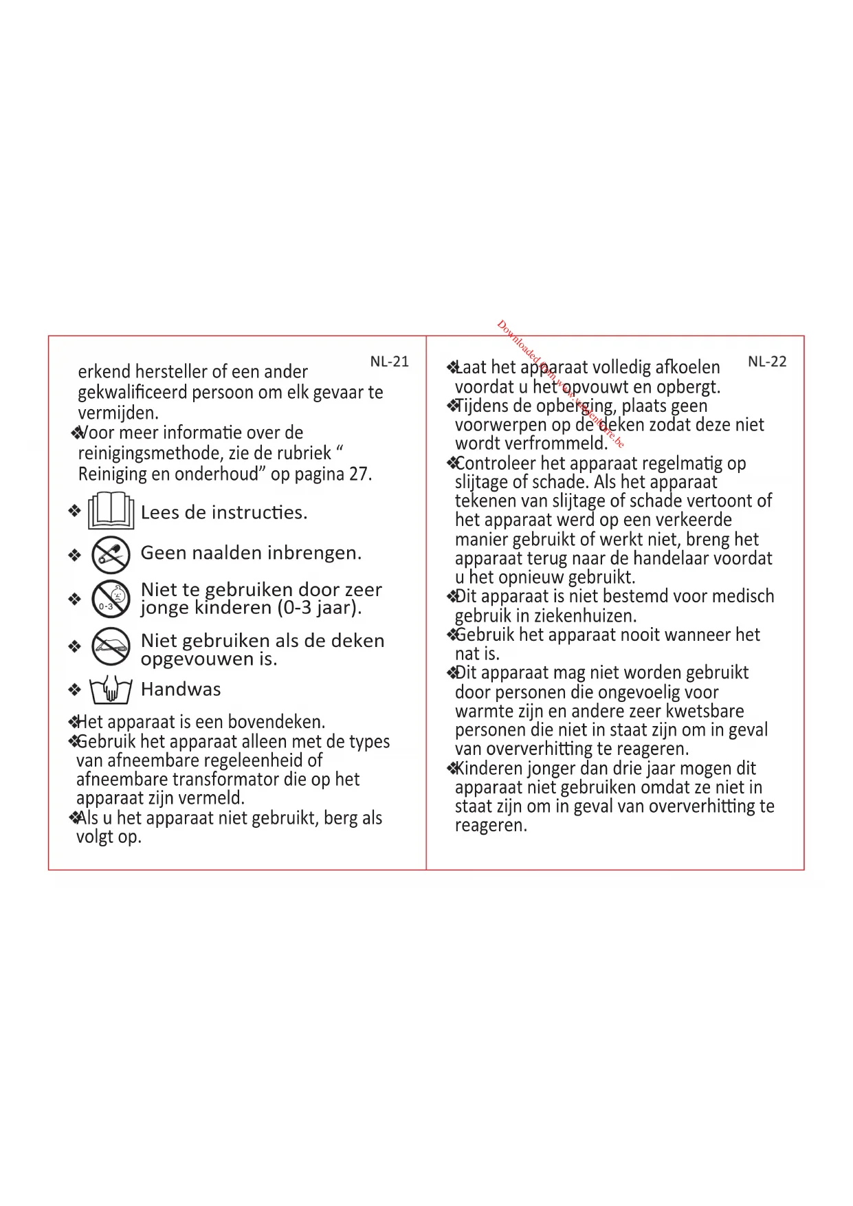 - Gebruik het apparaat alleen als een BOVENDEKEN – NIET als een onderdeken gebruiken.